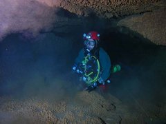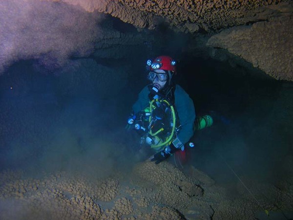 | A plusieurs reprises (Source des Eygues –12, exsurgence du Tibre -48) des plongeurs avaient observé, dans les siphons, une sorte de concrétionnement uniforme (sol, parois, plafond) assez particulier et limité uniquement aux parties noyées. Ce revêtement mamelonné doit correspondre, sous réserve d'études physico-chimiques, à un dépôt de type « entartrage » comparable à ce qui se passe dans un tuyau d'eau chaude (1). Ce phénomène a lieu lorsque de l'eau très chargée en minéraux, du carbonate de calcium dans notre cas, atteint la limite de solubilité qui dépend de divers paramètres (température, pression, équilibre ionique…) : le minéral surabondant précipite alors (comme la vapeur d'eau qui se transforme en gouttelettes de pluie) et se dépose en partie sur les parois (2).. Ce cas est celui d'une eau ayant circulé assez longuement à une profondeur relativement importante, surtout si elle est à l'origine relativement acide et chargée en CO2, ce qui lui permet de dissoudre une quantité importante de calcaire. Au cours de sa remontée, elle se refroidit légèrement et surtout sa pression diminue, ce qui abaisse la quantité de CaCO 3 susceptible de demeurer en solution(3).. Si ce seuil tombe au dessous de la quantité réellement présente dans l'eau, l'excès précipite, en général à partir de germes cristallins préexistants, donc sur les parois(4). . Si cette explication est bonne, on doit avoir ou avoir eu à la sortie : - une eau saturée en carbonate de calcium, au moins en période d'étiage, - une eau un peu « tiède » (au dessus de la moyenne locale qui doit être voisine de 10°) par suite d'apports profonds relativement importants.