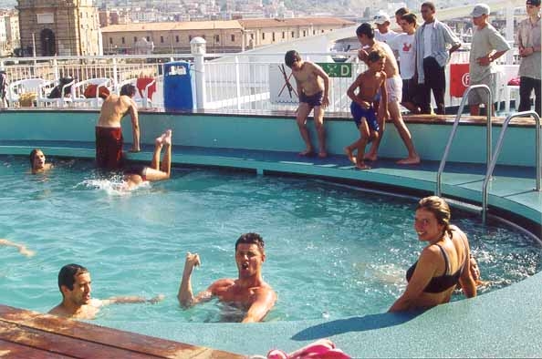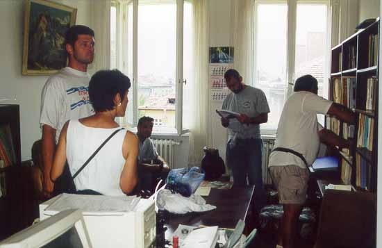 Des embouteillages nous retardent passablement tant sur le trajet aller que le retour. Finalement, après avoir chargé les affaires de David et Laurent, je gagne encore quelques heures d'embouteillages avant de retrouver Montpellier, écrasée par la Canicule vers 16 heures ». Marilyn : « Nous partons à 19h40 de Montpellier, avec un camion de location chargé jusqu'au plafond de matériel. Direction Nice, Ancône et Igoumenitsa en Grèce ». Marc : « Départ de Bruxelles à 8hr le chargement terminé. Peu de monde sur la route. Bivouac le soir, vers 21hr un peu avant Parme en Italie. Casse-croûte frugal et dodo ». Jeudi 2 août Marilyn : « 24h La pause repas se fait au-dessus de Monaco, dans une aire où un tas de gens dorment par terre. 24h10 Nous sommes à la frontière italienne. 2h Arrêt de 4h pour dormir. L'arrivée au port d'Ancône se fait à 11h45, c'est le port d'où nous devons prendre le bateau pour Igoumenitsa. Les camping-cars se rangent sur le pont Open –deck et nous faisons heureusement partie des chanceux qui se rangent sur ce pont aéré. La file interminable des semi-remorques, des voitures et des camping-cars commence enfin à avancer. Nous avons un exemple typique du “sang-froid ” italien au moment de faire les manœuvres dans le bateau. A 17h30 nous avons enfin le loisir de nous précipiter dans la piscine d'eau de mer sur le pont pour se décrasser de ces journées de trajet sous la canicule, avant de nous jeter sous des douches fraîches a souhait. Il fait chaud sur le pont des véhicules, et nous dormons plus où moins mal suivant les personnes ». Marc : « On se remet en route le lendemain vers 7hrs après un levé à l'aurore vu que Roger s'est fait déguster par les moustiques toute la nuit ; les pauvres ont du se payer une belle indigestion. On arrive à Ancône vers 11hr suites aux habituels embouteillages sur le périf de Bologne. On cherche un peu et on tombe sur Gordan venu de Split le matin très tôt. Frank arrive avec Marilyn, suivi une heure plus tard par Boubou et Fabienne. On se vide une chope et on s'en va faire pointer nos billets. Ensuite, on glande joyeusement trois bonnes heures sur le port en attente d'embarquement. On finit par monter sur le bateau à l'heure du goûter et l'ancre est levée dans les temps aux environs de 18hr ». Vendredi 3 août Marilyn : « Débarquement à 8h30 en Grèce. Nous montons directement dans la montagne et passons au point culminant : le col de Contara à1700m d'altitude. A 13h nous décidons de nous arrêter aux Météores. Ce sont de grandes falaises, avec des monastères au sommet, et des restes d'habitats troglodytiques. Nous restons un moment pour prendre des photos. A 20h, nous nous arrêtons pour dormir au bord du lac de Lithotopos, dans une aire de camping très sale, a l'image du pays ». Boubou : « Nous avons traversé le berceau de la démocratie universelle! Visiblement, ils n'ont gardé que le berceau ?! » Marc : « Débarquement à Igoumenitsa le lendemain matin à 8hr. On fait les pleins et on se lance immédiatement dans la traversée de la Grèce. Pique-nique aux « Météores » à deux pas des monastères. On termine la route décidément sans grand intérêt et on campe le soir à une vingtaine de kilomètres de la frontière ». Boubou : « Oh, Lac, L'année à peine a fini sa carrière, Samedi 4 août Marilyn : « Après le petit déjeuner, nous prenons la direction de Sofia. A 9h30, nous arrivons à la douane Grecquo-Bulgare, où toutes les formalités nous prennent beaucoup de temps : entre les lavages dans l'eau sale pour payer un droit de passage et les “petits plus ” qu'il faut verser aux douaniers, il y a aussi les gamins qui lavent les pare-brise des voitures et qui, quand on leur fait non de la tête, le font quand même du fait que les signes sont inversés chez eux. Jusqu'à Sofia, les directions sont : Sandanski, Kresna, Blagoevrad, Stanke, Dimitrov, Sofia. La recherche du passage dans la ville est épique : Gordan lit les panneaux écrits en cyrillique et Marilyn cherche sur la petite carte si les noms correspondent. Nous avons rendez-vous devant les locaux du ministère des sports avec le secrétaire Triphon, qui nous invite chez lui. Sa femme Nina parle français. Ils insistent pour que nous mangions chez eux et nous offrent l'hospitalité pour la nuit. Vers 21h, nous avons enfin des nouvelles de Richard et Laurent qui ont eut du retard avec leurs avions et dorment chez Alexeï, Jalov. » Marc : « On repart le matin à 8hrs. En approchant de la douane, nous doublons l'interminable file de camions en attente. Malgré cela, il nous faut 2 hr pour les formalités de douanes et de change ( 1 DM = 0,993 Lev ). Nous sommes à Sofia pour diner. On donne un ou deux coups de fil et nous arrivons finalement vers 15hr au siège de la fédé. C'est Triphon et un ami qui nous accueillent. Après les salutations d'usage, Tryphon nous propose d'aller directement chez lui car Alexey Jalov, notre contact en Bulgarie, est parti chercher Laurent et Richard à l'aéroport et n'est pas contactable. Nous attendrons donc des nouvelles en faisant connaissance avec Tryphon et son épouse Nina. Nous sommes invités à souper et à passer la nuit chez nos nouveaux amis. L'accueil est vraiment chaleureux et nous vidons nos premières « Pivo » en bavardant joyeusement. Alexey et les retardataires ne nous retrouverons que le lendemain car leur avion avait du retard. » Pensée du jour : « Le cyrillique, en anglais, c¹est pas facile non plus ! » Dimanche 5 août Marilyn : « Après l'arrivée des retardataires du soir précédent, et le petit déjeuner bien garni, nous prenons la direction de Vratsa, la ville proche du lieu de camp. A 10h, Frank se rend à la station de radio locale pour une interview, pendant que nous assistons à un très joli “défilé de brochettes. ” Le temps de faire les courses, nous arrivons au camp à 14h45 : il se compose d'un chalet en bois genre ca