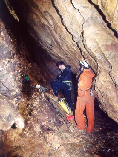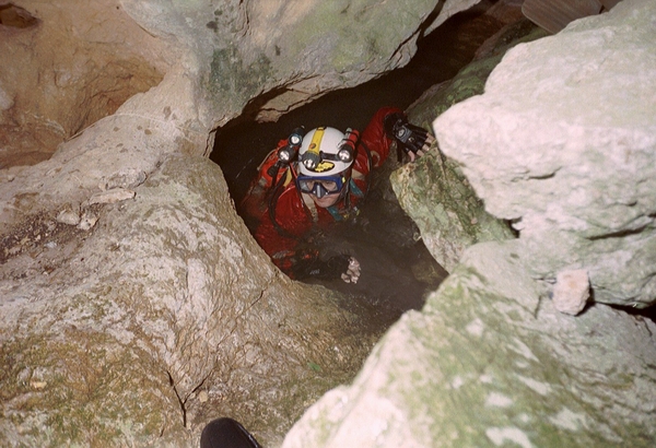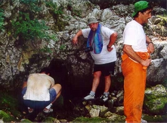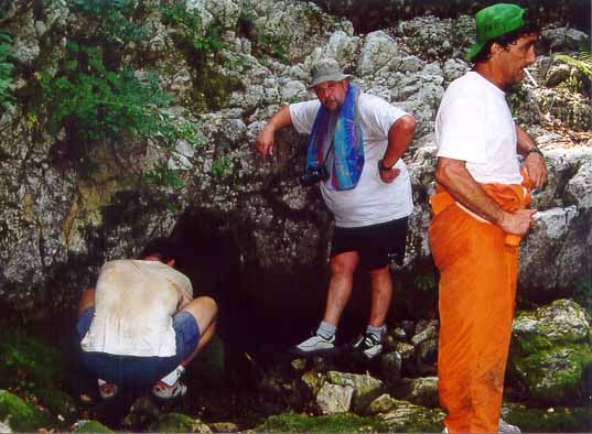 Marc : « La route pour se rendre à l'endroit où nous devons abandonner les véhicules est en assez mauvais état et, de plus, divers chantiers sont en cours ce qui nous fait perdre pas mal de temps. On est s à pied d'œuvre une heure plus tard. Plaman nous indique le thalweg dans lequel doit se trouver « Medjata ». Les recherches commencent vu que Plaman n'est pas très sûr de la localisation précise de l'entrée. C'est finalement Marc qui trouve le trou tout en haut du torrent temporaire. C'est une petite ouverture ovale de 1.5 m x 0.75cm. Une chauve-souris occupe manifestement l'endroit. On jette une pierre, mais aucune trace d'eau n'est perçue. Boubou décide de malgré tout de tenter sa chance. Il trouve l'eau à un niveau plus bas que prévu, mais renonce finalement car il découvre des traces de recherches (tuyau et câbles). Pour « Sokolska », la grotte est atteinte après une heure de montée à travers bois. Le dénivelé est relativement important et nous perdons pas mal de temps en recherches. Il nous a fallu essayer plusieurs talwegs avant que Plaman et Frank ne trouvent le bon passage. Intéressante tout de même, la découverte de deux très vieux phénomènes karstiques, deux salles en fait, très concrétionnées qui pourraient avoir été deux anciennes sorties d'eau aujourd'hui colmatées par le concrétionnement. En montant, nous passons d'abord devant « Izvora », la petite source temporaire située 60 m. en dessous du porche de « Sokolska ». Déception: l'ouverture est minuscule et nécessite, au moins, une petite désobstruction à la main. Roger est donc contraint de renoncer à sa tentative et se joint au reste de l'équipe. Pour la grotte, on mettra une heure à atteindre le siphon situé à 600 m de l'entrée. En effet, l'itinéraire est agrémenté de deux ressauts de quelques mètres et d'une étroiture, le tout sans réelles difficultés. Roger, en short et tee-shirt, déguste un maximum, mais persévère. La vasque est atteinte vers 14.00hr. Marc se met à l'eau sans tarder. Gordan prend quelques clichés pendant que Plaman junior tourne avec sa caméra personnelle. La plongée est courte (10 min.). Marc a déroulé 60m avec arrêt sur rien à -15m. Comme il n'est pas un spécialiste du fond de trou, il préfère en rester là car la visibilité est pratiquement nulle au retour à cause d'importants dépôts d'argile. La suite est évidente: tout droit. Le siphon débute plein Est et tourne ensuite vers le Nord. Arrêt devant un gros bloc. Retour en arrière sur quelques mètres pour trouver un point d'amarrage au point 55 m. Curiosité: la présence dans le siphon de plusieurs vers ressemblant à des lombrics. On quitte le siphon à 15.40hr. Nous arrivons au minibus vers 17.30hr. On récupère la voiture et, sur le chemin du retour, Plaman et Krasimir nous paient un pot dans un petit café de village. Fin d'après-midi, Boubou va jeter un oeil dans la source qui se trouve à côté du camp. Il s'arrête devant une étroiture. A revoir. Le portage et la mise à l'eau sont faciles. Il y aurait aussi le siphon situé au bout du réseau à voir. Celui-ci, selon Alexey serait un regard sur l'actif.» Boubou : «D escente dans la vasque dont le fond est un éboulis ,tête en avant, bi-5 aux côtés. Erreur de jeunesse! Pas le bi-5, la tête en avant?! Le laminoir, tentant, trop tentant, s'ouvre à moi. Je m'y engage fissa sans me rendre compte qu'une partie de l'éboulis me suit. Arrêt sur blocage par blocs et raclage dos-poitrine. Petite désob en marche arrière puis retour près des copains... » Pensée du jour : « Pour plonger bouteilles aux côtés, il faut virer les culs! Voilà comment on est passé à l'Euro, on a viré l'Ecu. » Marc raconte : Tout là-haut sur la montagne... « La plongée spéléo se divise en deux grandes activités : la plongée « résurgence » qui permet de parcourir des siphons, parfois longs et profonds, dont l'accès, aisé, permet d'amener tout le matériel désiré ; et la plongée « fond de trou » dont les siphons sont situés à l'extrémité réseaux souterrains parfois difficiles et qui, par la force des choses, nécessite un équipement ultra-léger et une technique de plongée adaptée en conséquence. A -15, le siphon fait un brusque coude et se dirige maintenant plein Est. La profondeur se stabilise. Je progresse encore de 20 mètres. J'arrive dans une zone de blocs. Je survole le premier et constate que la galerie amorce un nouveau cran de descente. J'ai vue jusqu'à -17. Equipé comme je le suis, il ne serait pas prudent d'aller plus loin. Je m'arrête, à –15 m de profondeur, à 65 mètres de mon point de départ comme me l'indique la marque sur mon fil d'Ariane. Je cherche un point d'amarrage qui facilitera la tâche de celui qui, chanceux j'espère, viendra ici après moi. Rattrapé par la touille que j'ai soulevé, je n'ai pas le temps de mettre la main sur le fractio convoité. Je rebrousse chemin et, vers le point « 55m », je mets la main sur un très beau rocher qui fera parfaitement l'affaire. Je n'y vois plus grand chose, aussi, c'est avec la plus grande prudence que je coupe le fil après avoir fait mon nœud d'amarrage. Je ressorts à tâtons. Toute l'équipe est là qui m'attend. Je prononce alors les deux mots magiques qu'ils attendent et qui, à chaque fois, nous font frémir : « ça continue ! » Ma plongée n'a pas duré 15 minutes et je n'ai parcouru que quelques dizaines de mètres d'un obscur siphon boueux, mais, j'étais en « première »; et ça, c'est une sensation irremplaçable, c'est le vrai moteur de notre activité, c'est pour ça que, à longueur d'année, nous nous entraînons, c'est ça qui nous a conduit ici, tout là-haut sur la montagne, à des milliers de kilomètres de chez nous, c'est ça qui, dans quelques jours, conduira à mon terminus un autre membre de l'équipe. Pour quelques inoubliables minutes, la « première » fait de nous plus que des plongeur