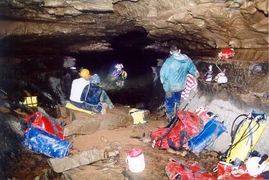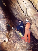 Départ en pointe dans le siphon terminal de Temnata dupka. Photo Gordan POLIC. Portage dans les galeries d'entrée de Sokolska. Photographie : Gordan POLIC.