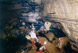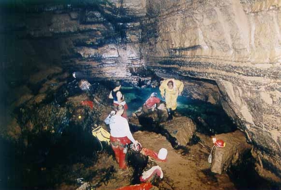 Il manquerait à vérifier d'où sort le courant qui se manifeste dans la partie active, et à trouver pourquoi les plongeurs ne le retrouvent pas dans le siphon. » Marc : « Finalement, le temps se calme et Roger et Frank partent faire une tentative à Jabokrek en fin de journée. Ils reviennent enchantés: la jonction est faite. Ils ont déroulé 45 m de plus et son sortis dans une grande salle où ils ont aperçu des chauves-souris. Pour amarrer le fil, ils avaient emporté des piquets de bois de 50 cm qu'il leur suffisait de planter dans l'important dépôt que couvre tout le fond de la galerie. Ils ont également vu plusieurs écrevisses voraces dans le siphon. Ils ont fait toute la topo. Objectifs pour le 13/8: Pour le 13/08 : - Sokolska : Laurent, Richard, Mari, Gordan + 5 spéléos du club de Pleven. - Izvora : Roger, Marc. - Medjata dupka : David, Frank. Lundi 13 août Marc : « On s'est mis en route de bonne heure vu les gros portages à réaliser. 1) « Izvora »: Roger et Marc arrivent à la vasque sans encombre par le chemin reconnu la fois précédente. Marc fait un brin de désob pendant que Roger s'équipe léger. Il se met à l'eau sans palmes vu l'étroitesse du trou. Il ressort après 5 minutes seulement. En fait, le siphon s'élargit un peu à un mètre de l'entrée et prend la forme d'une faille que l'on suit jusqu'à -3. Là, pas de chance, des blocs barrent irrémédiablement la suite. De plus, tout est instable et donc assez peu engageant. Rideau! Marc prend quelques photos de la mise à l'eau. 2) « Medjata »: La vasque a un diamètre de 4 mètres, environ. David se met à l'eau en bi-4l. Il descend rapidement à -6 dans la vasque. Ensuite, cela devient plus étroit. La suite est un laminoir en pente avec un fond de graviers. Il avance encore un peu, mais ça continue à se rétrécir et la touille le rattrape bientôt. Ici aussi: rideau ! Il se confirme que des restes de pompage sont abandonnés depuis au moins 10 ou 20 ans à proximité du siphon. David : « Frank et moi avons été laissés sur le bord de la route qui mène au siphon de la grotte de l'ours, le reste de l'équipe est parti plonger à Sokolska. La marche d'approche est de quarante minutes à travers un petit sentier chaotique puis dans l'escalade d'un couloir rocheux. L'entrée de la grotte n'est pas très grosse (1m 50 de diamètre) l'évolution se fait dans une galerie étroite sur 30 mètres, la fin du boyau se finit en toboggan puis en un ressaut d'un mètre pour déboucher au départ du siphon. Frank m'a aidé pour me passer les bouteilles et le reste du matériel. La vasque du siphon mesure 4 m de diamètre. L'eau est claire, pour l'instant je distingue au fond de l'argile. Je m'immerge le fond est à 6 m de profondeur la suite du siphon est dans un laminoir, je m'engage dans celui-ci les pieds en avant en prenant soin de bien placer mon fil. Je me faufile raclant mon bi 7l, je dois évoluer tantôt à droite tantôt à gauche pour passer au plus large du siphon, au bout de 10 mètres de progression dans le laminoir je baisse la tête pour trouver la suite. Un nuage de touille m'aveugle complètement je décide de stopper cette exploration (limite psychologique) j'amarre difficilement mon fil et récupère mon dévidoir. Le retour fut pénible surtout lors de la sortie du laminoir.La suite du siphon doit se faire par des plongeurs aguerris à ce genre d'exploration ( étroiture et touille ) je pense plus particulièrement à notre ami belge qui aurait dû plonger celui-ci et qui par faute de temps à du rentrer chez lui, c'est pour cela que je nommerais ce trou : le trou à Boubou. » - 3) « Sokolska »: C'est Laurent qui a fait la pointe en bi-9l. Il retrouve sans problème le terminus de Marc et raboute son fil. Il progresse jusqu'au bloc aperçu lors de la première plongée. Il continue sur quelques mètres. La galerie descend un peu et ensuite la galerie fait un brusque coude vers la gauche et se termine sur éboulis. Il fait quelques recherches mais la sans trouver de passage. Il rebrousse chemin et ressort. En revenant, il croit avoir entendu le bruit de ses bulles crevant dans une cloche à quelques mètres de la mise à l'eau, mais le touille l'a empêché d'aller voir. C'est le dernier espoir, sinon, c'est fini. Une ultime pointe pourrait donc être tentée, mais les chances sont minces et cela ne doit être qu'un objectifs de replis. Plongée 20 min/-17. Le développement est donc de 70 m/ -17, arrêt sur éboulis. Laurent pense que la galerie explorée ne serait en fait qu'une branche morte ce qui expliquerait l'important dépôt argileux. A revoir, si on a le temps... » Marilyn : « L'équipe qui part pour Sokolska est composée de Gordan, Richard, Mari et Laurent plus 5 porteurs. La marche d'approche est rude et chaude, mais dès que l'on arrive à l'entrée du trou, la température chute de plusieurs degrés. Pensée du jour : « Le paradoxe avec les plongeurs, c'est qu'ils mangent dans de la vaisselle sale. » Objectif pour le 14/8: Comme prévu, pointe de Frank avec photos par Richard à « Temnata ». Il y aura 11 charges à porter à l'aller et deux de plus au retour vu le matos à ressortir (relais 9l, détendeurs, canot). Plongée avec tous les porteurs à Temnata ( y compris Triphon et sauf Roger). Mardi 14 août Marc : « Tryphon et Nina nous ont rejoints. Ce sont eux qui assureront l'intendance pendant quelques jours en remplacement d'Alexeï. Départ du camp de bonne heure. Nina et Roger, après avoir déposé les autres à la grotte, vont faire des photos dans un canyon proche. Tous les autres s'équipent pour « the big one ». On se partage les nombreux sacs et c'est parti. On progresse rapidement et le siphon est atteint en 55 minutes. Tryphon et quatre des porteurs ont déclaré forfait au bord du premier lac. Ils nous attendront là car le passage en canot ne les tente vraiment pas. Il faut dire à leur décharge que, pour la plupart, ils plutôt sont mal