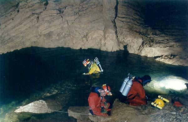 Frank raconte: "Le premier siphon est franchi sans encombres. Le fil d'ariane en place est en bon état et j'aperçois un protée, qui a tôt fait de s'éclipser. Par contre, la sortie du siphon n'est pas réjouissante. Un conduit bas émerge dans une petite vasque. Il faut ensuite passer une étroiture et ramper pendant 5 mètres dans un boyau aquatique, gorgé d'argile liquide. Commence alors la véritable galère, un talus argileux, voire un laminoir incliné oppose les pires difficultés, puis se prolonge par une diaclase étroite argileuse à souhait. Ensuite, on débouche sur un vaste lac qui, d'après l'orientation de la galerie pourrait correspondre à un départ en rive droite aperçu dans le S.1. S'ensuit alors une succession de ressauts glissants nécessitant des agrès. Retour à la sortie du S.1 après avoir équipé en corde le laminoir argileux, sans trouver les spits indiqués par Tihomir et Mladen. Gilles et Richard, parvenus dans la vasque de sortie, sont informés du programme des réjouissances. Ils me croient sur parole et retournent dans le S.1 à la recherche d'un départ, puis émergent sans problème dans le premier lac post-siphon. Nous récupérons un bout de corde et équipons les passages afin d'inspecter la galerie, qui s'avère radicalement différente des informations et topographies données par nos hôtes: pas l'ombre d'un protée, deux affluents pollués et malodorants, un étage supérieur et une multitude de traces de pas."
