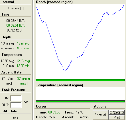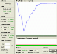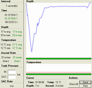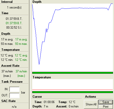 Le profil de cette plongée est un peu spéciale, avec un 1er siphon à 94m, le 2 ème à 42m et le 3 ème arrêt à 13m, qu'il faut refranchir dans l'autre sens pour rentrer