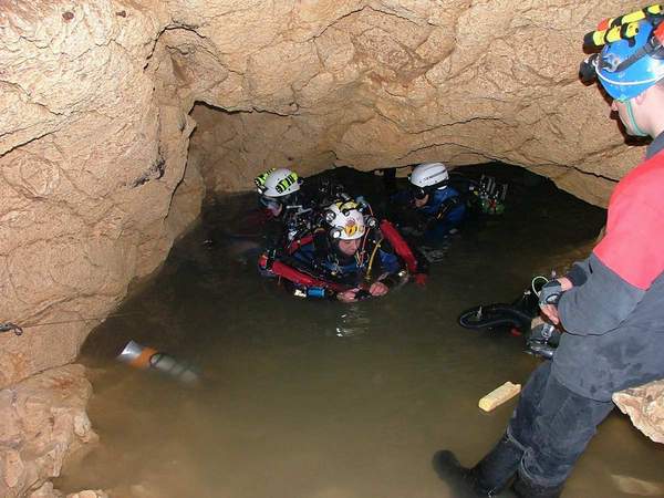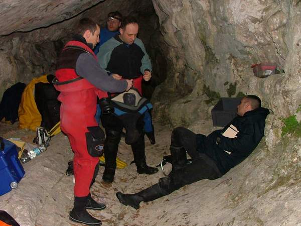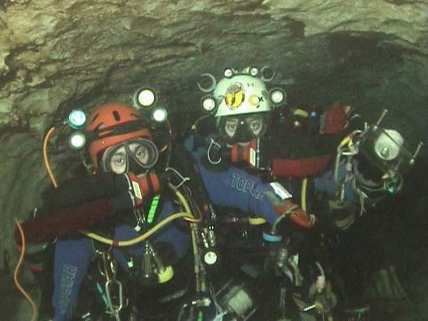 Ils doivent déposer deux 6 L de nitrox en sécu à 21m et 39m, et prendre une caméra pour me filmer lors de mon passage. Mais lors du branchement des batteries d'éclairage dans l'eau, que j'ai mis en court circuit, un dégagement d'acide, manquera de nous asphyxier tous les trois dans la vasque
