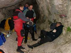 Nous arrivons sur site à 9h du matin, avec deux 4x4, ceux de David et Laurent, pour franchir la rivière et arriver au plus prêt de la grotte. Les berges ayant été réaménagées, il nous faut mettre les véhicules en travers de la rivière et décharger notre matériel sur le dessus d'un talus 1,5m. Après un effort de 1h30, pour descendre notre matos de plongée dans la grotte, et un petit briefing, pour mettre au point les déposes et le run time, Yves et Laurent commencent à s'équiper.