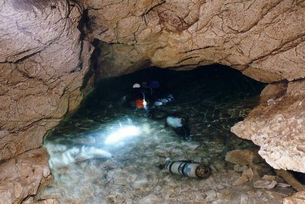 Le niveau dans la caverne était six mètres plus bas. Aussi, le siphon débutait vingt mètres plus loin que dhabitude. Nous sommes arrivés dans laprès-midi pour préparer la plongée du lendemain, en fonctionnant en équipe et en transportant les bouteilles et tout léquipement jusquà la vasque.