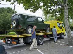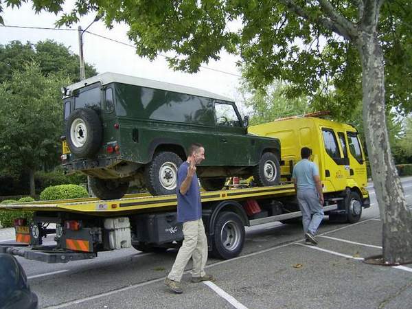 Le lendemain fut moins réussi parce que le puissant Landrover est tombé en panne. Il a fallu le remorquer sur un plateau jusquau garage pour être réparé. Ce nétait pas amusant. Notre aide sest limitée à prendre des photos.