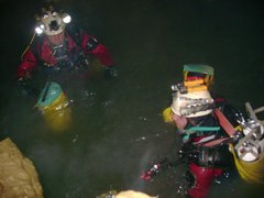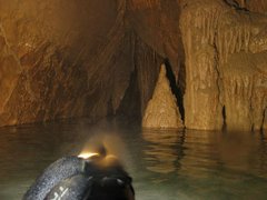 Les Lacs d'Arphidia sont bien alimentés par une arrivée d'eau. Mais laquelle ? Nous pensons toujours que cela vient par le dessous, par un siphon, sauf que nous n'avons pas encore trouvé le passage. La prochaine plongée aura lieu vers mi-décembre. Nous espérons trouver une réponse dans ce premier gros lac non exploré en profondeur.
