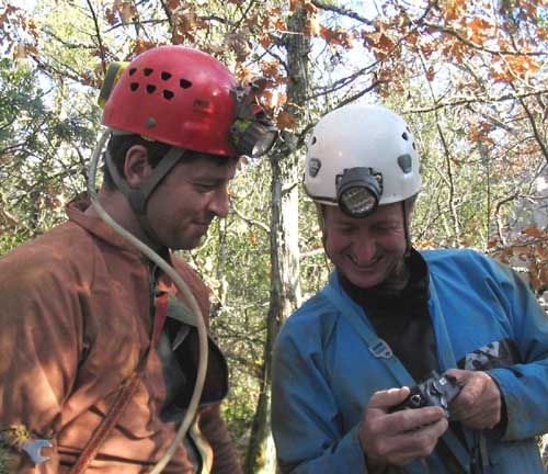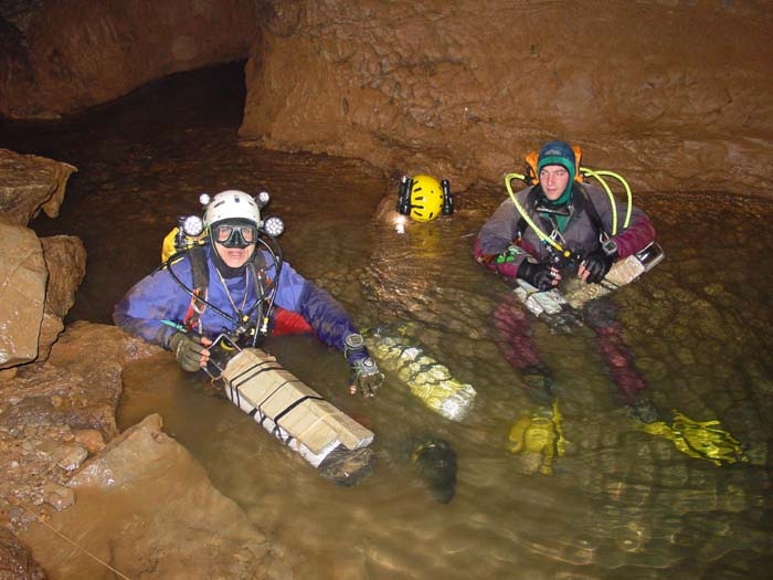 Exploration de février 2004 par Jean-Pierre Baudu. Nous avons déjà bien avancé la topographie jusqu'à –27 mètres dans le S8. Avec Frank, nous décidons de réaliser la topographie jusqu'au siphon terminal. Nous emportons 200 mètres de fil et le gaz qui devraient nous permettre de poursuivre les explorations. Le moral est au beau fixe, surtout que la fin est donnée pour être une étroiture ensablée. Nous décidons de changer devant le S10 notre configuration de bi7 litres dorsal en restructuré (latéral). Pour l'heure, nous avons 13 bouteilles (Frank et moi), une 10 litres de nitrox 45% pour rejoindre le S5, une 4 litres de nitrox 45% que nous laissons en sortie du S7, dans le S8 nous emportons 2 bouteilles pour le traverser, une 10 litres de nitrox 45%pour la zone du début avant la grande descente et une 12 litres 30% pour la zone profonde et la fin du siphon et le S9. La fin va s'effectuer avec le bi 7 litres. Frank prend une 4 litres supplémentaire en sécurité pour les 4 siphons d'entrée. Deux plongeurs nous apportent deux bouteilles chacun jusqu'au S8 (David et Damien). Le mercredi 4 février, un groupe de spéléo mené par Frank équipe la cavité et descend déjà 10 bouteilles pour la pointe. Cela nous permet de nous apercevoir que les niveaux sont hauts. La visibilité est de 2 mètres. Après de longues soirées au téléphone pour trouver des camarades pour l'acheminement du reste du matériel, les préparations du fil et des mélanges (Nitrox), nous arrivons au jour J. La cavité est reéquipée (précaution pour le matériel en place) puis les charges descendent rapidement. C'est parti pour David et Damien, puis c'est notre tour. Nous sommes pourvus de notre bi 7 litre dorsal et de deux relais de 10 litres. Les siphons s'enchaînent jusqu'à la sortie du S3. Nous franchissons une courte escalade inconfortable avec les blocs sur le dos et nous nous faisons passer les nombreux relais. Nous plongeons le S4 pour sortir dans un passage étroit encombré de spéléo-plongeurs. n ous nous marchons dessus pour enfin sortir de la trémie et porter nos blocs jusqu'à une diaclase étroite qui nous oblige à faire la chaîne. Cinq minutes de pose devant le S5 et nous passons les siphons S5, S6, S7 entrecoupés de passages plus ou moins larges… l 'ensemble est franchi avec notre relais de 4 litres, notre bi 7 litres dorsal et un de nos relais de 12 litres. Enfin le S8, pour David et Damien c'est la fin bien méritée. Une petite margelle étroite et peu confortable mais hors de l'eau leur permet de nous attendre. Nous mangeons une petite barre et c'est reparti. Nous posons notre premier relais en haut du grand puits et c'est la grande descente, superbe puits, un vrai plaisir. A notre précédent terminus, j'attache mon fil et Frank topographie. Après le point bas, la remontée est rapide. Mon détendeur (détendeur en prêt) est en légère surpression, je consomme plus que d'habitude mais sans m'inquiéter. Le post-siphon s'avère moins confortable que nous l'avions espéré. Nous nous déplaçons à quatre pattes, les blocs sur le dos en tirant une 12 litres, c'est dur !!! Je suis moins grand que Frank et je passe un peu mieux. Frank propose que nous abandonnions notre relais. A la sortie du S9, le bruit caractéristique d'une cascade se fait entendre. Superbe, j'adore les beaux actifs. Frank enchaîne l'escalade et cette fois sa grande taille lui est favorable. Pour moi, c'est plus difficile. Je laisse beaucoup d'énergie dans ce passage. Nous atteignons le dernier siphon, le S10. Frank me propose de passer devant, il fera la topographie. Je transforme mon brelage et je positionne mes bouteilles en restructuré (relais). Frank reste dans la même configuration. J'attache mon fil et déroule. La morphologie change, la galerie devient plus sinueuse. Après un virage à gauche et un départ vu sur la droite, je rejoins le point bas à –18 mètres. Le sol est recouvert d'une fine pellicule de sable. L'étroiture terminale de nos prédécesseurs est infranchissable. Je reviens dans une touille terrible en notant quelques points topographiques. Une tension brusque sur le fil me le fait perdre. Je le cherche avec les bras, sans succès. Puis j'avance d'un mètre et refais la même opération pour enfin sentir mon fil. Je retrouve Frank dans la vasque. Nous avons vu un départ à droite. Nous replongeons et sortons du siphon. L'exondé est étroit et Frank me laisse plonger le S11'. e n fait, je retrouve la liaison observée au point bas du S10, mais à droite je ressors encore dans un nouvel exondé. j 'entends la cascade au loin. Je suis de retour sur mes palmes. Une escalade à gauche permet de remonter de 10 mètres. Je retrouve Frank et partageons avec les Niphargus un peu de gruyère et de jambon. C'est l'heure du retour. Je récupère devant le S8 ma 12 litres mal fermée (prêtée) et toujours ce détendeur en surpression. Dans les premières dizaines de mètres, le détendeur se met en débit constant. Nous avons notre bi 7 litres peu entamé donc avec une réserve importante d'air. C'est un cas d'école, une bouteille que je ne connais pas (robinet un peu dur), un détendeur tout neuf (défaut sur un écrou de réglage du deuxième étage) et nous nous retrouvons dans la situation où la bouteille déjà entamée au départ du S8 (au retour) se vide rapidement. De plus, je me retrouve avec une bouteille trop légère qui me déséquilibre. Je ne suis pas réellement en danger (réserve d'air importante) mais à long terme, le stress et la fatigue aidant cette situation peut devenir préoccupante. Nous retrouvons David et Damien frigorifiés. i ls ne nous laissent pas le temps de souffler et nous revoilà, enchaînant les derniers siphons. Merci à tous nos camarades qui nous ont aidés… |