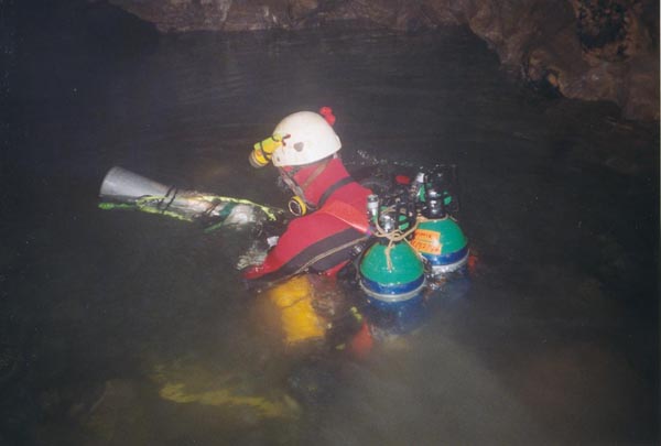 départ plongée dans le siphon terminal le 18-08-2002 (photo C. Kupiec) |