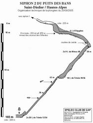 Le spéléo-club alpin de Gap a poussé une petite pointe dans le puits des Bans (Saint-Disdier / Hautes-Alpes). Pour ceux qui ne connaissent pas la cavité, il s'agit d'une émergence temporaire dont le fonctionnement se rapproche de la grotte de la Luire (26) avec une mise en charge de 225 mètres. L'état actuel des niveaux d'eau permet d'atteindre le siphon 1 à -209 m pour environ 1 km de développement de l'entrée. Le siphon 1 se franchit facilement puisqu'il ne fait que 10 m de long pour 2 m de profondeur. Mais il sépare les deux plongeurs du reste de l'équipe.