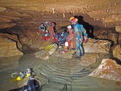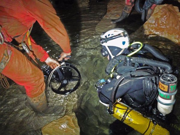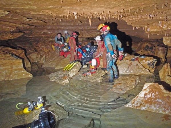 pour continuer à dérouler mais il est bloqué par un noeud bien serré. Retour rapide vers la zone des 400 mètres. Pourtant, malgré le scooter, je sens monter l'essoufflement : le coup de chaud, le stress, l'irrépressible envie d'arracher le masque et l'embout pour mieux ventiler. Mais le passage sur circuit ouvert n'est pas sans conséquence. Pas de retour possible sur la boucle dans les conditions présentes. Je contrôle l'ensemble des paramètres, le PPO2 est bonne, mon diluant est très optimiste avec 35% de He2. Je purge ma boucle avec un bol de diluant frais. Ça va mieux, mais c'est de courte durée. L'hyperventilation reprend. Cette fois-ci, je stoppe mon palmage, je ralentis le scooter, je mets de l'air dans la combinaison et je vais raser les plafonds pour diminuer la profondeur. Les symptômes disparaissent. Arrivé à 400 mètres, tout va bien. Nouveau contrôle complet : RAS. Je démarre le relevé. Les visée sont longues d'un méandre à l'autre. Je suis vite aux 200 mètres. Rangement, récupération de tout le matériel et retour surface avec quelques paliers qui passeront par un retour à la palme pépère. La plongée aura finalement durée 2 heures au lieu des 3 prévues. Tout le monde est déjà de retour de quelques pérégrinations dans d'infâmes galeries boueuses autour du S2. Je reconditionne le matériel en l'enlevant et les kits partent dès qu'ils sont pleins. Le retour est calme. Concentré sur chaque pas, peu de mots s'échangent. Mais une fois dehors avec une bonne bière fraiche, les langues redeviennent loquaces. Et que dire des grillades et spécialités de chacun... Porteurs : |