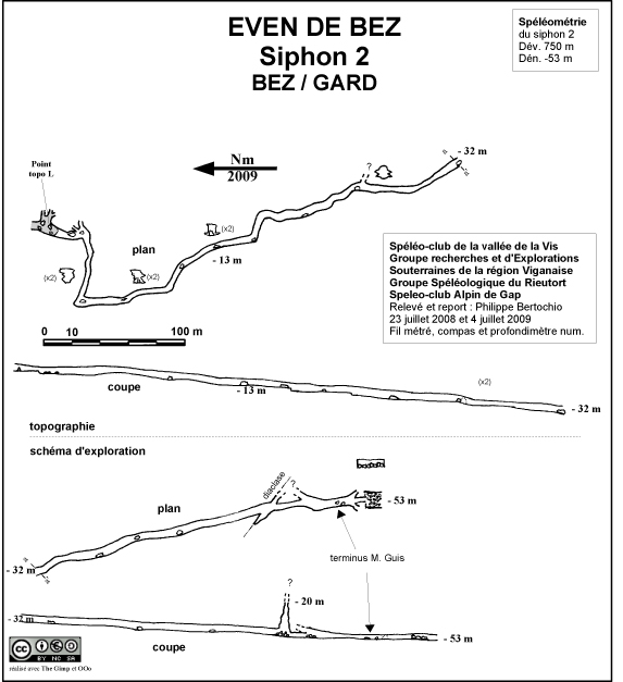 Le Spéléo club de la Vallée de la Vis et le Groupe spéléo du Vigan ont repris depuis quelques années l'étude et l'exploration des réseaux de la vallée de l'Arre. Les premières furent nombreuses et la plus belle a permis d'ouvrir la grotte de Calles, un petit bijou. Mais ces réseaux, attaqués par l'aval, se retrouvent rapidement bloqués par des siphons. Les explorateurs précédents, avares en informations et en topographies, ont contraint nos explorateurs à rechercher d'autres assistances. C'est dans ce contexte que je fus sollicité pour reprendre les plongées du siphon 2 de Bez afin de réaliser la topographie et de confirmer ou pas les théories élaborées sur la genèse du réseau. A ce jour, deux plongées ont pu être réalisées malgré la programmation d'une dizaine de sortie. Mais les conditions climatiques et techniques nous ont contraint d'annuler souvent. Depuis ma première plongée, le 23 juillet 2008, il aura fallu attendre un an avant de retrouver des conditions acceptables. Le 4 juillet 2009, je suis à nouveau à Bez, avec cette joyeuse équipe de spéléos acharnés. Qui dit siphon 2, dit siphon 1. L'essentiel de l'équipe n'étant pas plongeur et le matériel à transporter étant conséquent, l'équipe a opté pour le pompage du siphon. Démarrée la veille, la pompe permet de désamorcer en une vingtaine d'heures. Ensuite, le dernier plan d'eau est traversé en utilisant un câble inox où nous constatons qu'il ne reste que quelques torons. Même si la galerie semble horizontale sur la topographie, le portage jusqu'au siphon 2, environ 1 km, est particulièrement sportif. Jamais étroit mais toujours en diaclase plus ou moins large avec d'incessantes descentes et remontées. Il faut compter 2 à 3 heures de portage selon le niveau des équipiers. En revanche, l'arrivée au S2 est grandiose. La galerie prend l'allure d'un beau tunnel où serpente un petit actif sur un sol très travaillé par la corrosion : marmites, canyons, banquettes... et enfin la vasque du S2. Une pause est bien nécessaire avant de se mettre à reconstituer le matériel conditionné pour le portage. Afin de limiter le nombre de charges, 8 au total, j'ai opté pour une configuration un peu bâtarde que je regretterai.