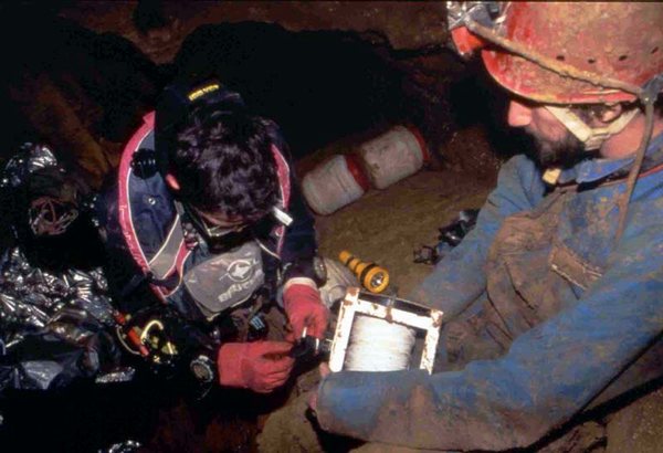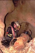 Nous décrivons ici les plongées du 16/04 et surtout celle du 18/06/94 (Cf. Récit d'époque de Yves Audouin, maintenant réfugié en Allemagne pour oublier). Passons en effet rapidement sur la plongée du 16/04, réduite à une reconnaissance plongée en lac à la verticale, puisque je n'avais pu monter qu'une seule des bouteilles que m'avaient prêtées JPStef avec mes détendeurs (mais merci encore à toi !), à cause de la forme des protections de robinetterie si je me souviens correctement avec 10 ans de recul… et n'avais rien vérifié avant de partir (erreur de jeunesse – c'était ma première plongée fond de trou pour ma défense) ; les valeureux porteurs auraient pu et dû me "pourrir" davantage qu'ils ne l'ont fait...