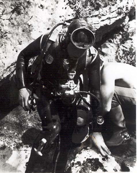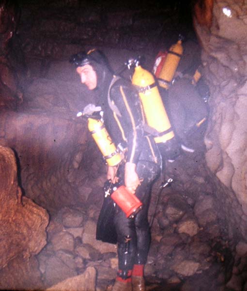 Nous tournions sur nous même Mickey et moi pour voir s'il y avait une ultime solution, et on l'a trouvé pour continuer. C'est drôle, vous voyez ces dessins animés ou il y a un chat qui court après une souris. Au bas du mur de la pièce dans la maison, il y a toujours un trou de souris ou elle peu ce réfugier, ce petit trou un peu arrondi !! Je me faisais rapidement cette réflexion en me disant que c'est ce que l'on voyait. Un passage de ce genre au ras du fond de la paroi du puits. Nous nous sommes vite concertés Mickey et moi, avec un signe « tout ça bien » et l'index tendu pour ce dire « on y va ?? ». On s'est engagés, c'était étroit mais faisable. Notre trou de souris nous permettait de continuer un peu, mais ça descendait toujours et il fallait vite arrêter. Ce n'est pas notre fil d'Ariane qui nous manquait, on aurait pu aller beaucoup plus loin. Mais là on était arrivé à 35 mètres de profondeur. Nous étions à 20 minutes de temps et nos 3200 litres d'air dans notre scaphandre ne seraient pas éternels !! Nous devions vite repartir, des paliers obligatoires nous attendaient avant de refaire surface dans le lac souterrain, ou nous attendaient les copains. De plus, on ne se faisait plus d'illusions, aucune solution de cheminée remontante ou de départs de galeries nous donnant un accès à un réseau supérieur, pour déboucher, n'était possible. Notre exploration se terminait bel et bien ici, il n'y avait aucune possibilité, du moins, avec nos moyens de cette époque, des années 1970.