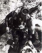 Nous tentons une première plongée dans le siphon de droite. Je plonge avec Mickey. Le siphon est d'une très grande beauté, car l'eau y est très claire. La profondeur moyenne de notre plongée est, au plus, seulement de 10 mètres. Nous parvenons à faire une distance de 40 à 50 mètres, mais très vite nous devons renoncer, on n'insiste pas. Une étroiture assez sévère empêche notre progression. Il va falloir réfléchir pour voir ce que nous pouvons faire ici. Demi tour et nous rejoignons notre équipe de soutien. Le lendemain, cette fois c'est la grosse expédition, nous allons explorer ce lac souterrain.