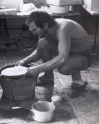 Mais dans l'ensemble, la bonne humeur régnait. Une grosse difficulté nous attendait et on le savait d'avance pour être venu déjà voir. Ce lac, sans être vraiment circulaire devait faire 10 mètres de diamètre. Le problème est que nous étions 2 mètres au dessus du niveau de l'eau et les parois étaient couvertes de glaise dangereusement glissante. Tout le monde s'affairait, branchait le téléphone pour communiquer avec les copains et copines à l'extérieur. Le dérouleur était en place ainsi que le boîtier de signalisation. Henri B., notre spécialiste en spéléologie a entrepris de faire fixer échelles et cordes. Nous ne pouvions pas sauter à l'eau comme cela, trop dangereux, on ne savait ce qu'il y avait sous l'eau. De plus, pour revenir, nous n'aurions pas pu remonter. Nous, les trois plongeurs, avons déposés nos scaphandres et, avec marteaux et massettes, nous creusions des points d'ancrages dans la roche, pour fixer des « spits ». Voici à quoi l'on ressemblait. Ce brouillard, visible, est du, en partie, à la condensation produite par nos respirations et aussi par la combustion de nos flammes acétylène.