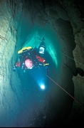 En attendant, c'était génial, dans cette eau très pure je découvrais un monde mystérieux et magnifique. Nous avions du parcourir une cinquantaine de mètre en distance, profondeur 20 mètres. Plus loin la galerie restait de même dimension : 1,50 mètre en hauteur, mais soudain elle pris des proportions d'au moins 5 mètres en largeur, alors que sa pente se faisait plus douce. Depuis le départ, cette galerie nous obligeait à faire, entre autre, un parcours sinueux,