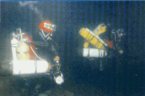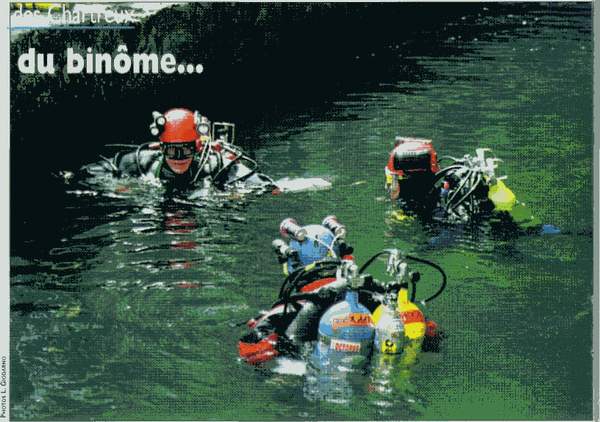 Débui 1997, nous effectuons notre première plongée, à deux dans cette cavité, atteignant les -127 m. Nous avons choisi l'option du binôme pour gagner du temps dans l'équipement : le fond du conduit est couvert d'argile. L'un déroule le fil d'Ariane el l'autre se concentre sur les aliaches. Cette technique s'est révélée très efficace. Benoît est un de mes meilleurs compagnon de plongée depuis des années ; nous nous sommes déjà immergés ensemble en dessous de -100 m de nombreuses fois, dans des conditions parfois difficiles, élaborant ainsi une technique d'assistance mutuelle convaincante, une sorte de communion.