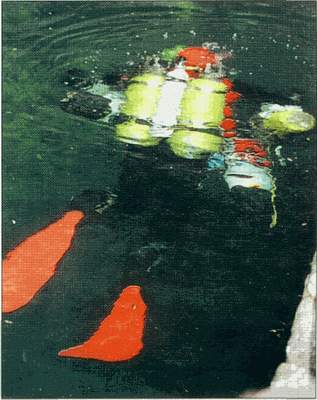 La plongée ne s'est pas achevée si facilement que ça puisque trois heures après notre sortie, nous souffrons tous deux de douleurs articulaires au genou. Selon Jean-Pierre Imberi, il s'agit d'un léger ;'bend" dû au long temps passé au fond, cumulé avec l'effort du pal-mage. Nous étions en limite de table. Pour la prochaine exploration, il lui faudra donc les modifier en augmentant la PPO2 au palier et en allongeant les temps d'oxygène.