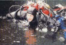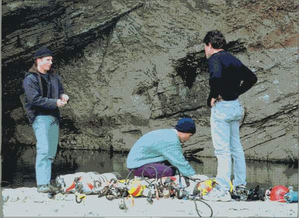 Début 1996, nous commençons par une plongée de reconnaissance dans la zone des -115 m, pour réaliser que l'équipement de nos prédécesseurs avait fini par lâche. Nous avons donc rééquipé méticuleusement cette portion en quatre plongées, le puits étant déjà muni d'une bonne corde de montagne.
