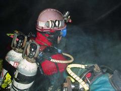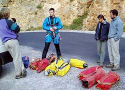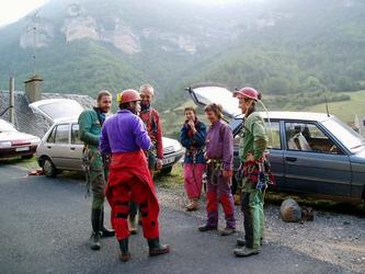 Le temps de déballer les onze sacs de matériel de plongée, d'assembler les scaphandres, d'équiper les bouteilles, de se parer des oripeaux et autres coquetteries de plongée assorties, le tout en avalant un ou deux sandwiches, et nous partons dans le S.2 (le S.1 est un autre siphon, situé dans la galerie des Ceps de Vigne).