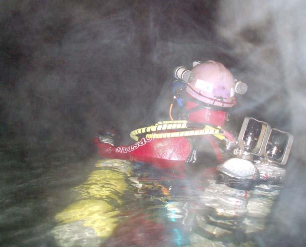 L'ambiance y est assez austère. Eau laiteuse (on aurait presque l'impression de s immerger dans un bassin de décantation), roche aux aspérités torturées, section indéfinissable, pas de morphologie distincte. Il faudra plusieurs essais pour trouver le bon fil (nos prédécesseurs ont du en découdre aussi, vu le nombre de ramifications et de culs-de fil), puis raccorder le dévidoir à un terminus de fil déchiqueté, pour remonter dans le conduit salvateur.