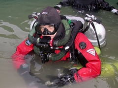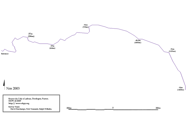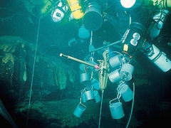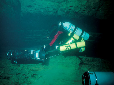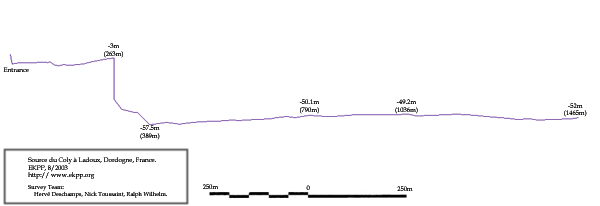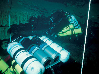 NDLR : Nous nous souvenons qu'en août 2001 Michael Waldbrenner, Reinhard Buchaly et leur équipe ont battu le record de pénétration dans les galeries noyées du Coly souterrain en parcourant une distance de 5000 m (Voir SD n° 159 p. 41-48). Un an après, les voilà qui récidivent et améliorent leur propre record en rajoutant 675 m à ce fabuleux siphon. La campagne de plongée s'est étalée du 17 au 24 août et un compte rendu circonstancié de ces journées vient de paraître sur le site Internet de l'EKPP que l'on consultera avec profit en tapant : http://www.ekpp.de/projects/doux02/history.html Nous remercions bien sincèrement les auteurs pour l'autorisation de publication de cette exceptionnelle aventure humaine qui concerne au plus haut point notre Périgord spéléologique, et plus particulièrement notre compatriote Hervé Deschamps avec qui nous avons dû échanger plusieurs courriers à propos des traductions. Aperçu de la semaine (traduction Alain Beverlain) Samedi 17 août : Après un voyage insipide de 12 heures par la route (avec un arrêt de 2 heures pour dormir), j'arrive au village de Coly à 10 h 30. Dans le parc où nous avons réservé trois bungalows pour la semaine, un certain nombre des membres de l'équipe sont déjà arrivés. Tout d'abord, Reinhard, Michael et Hervé doivent faire une visite de courtoisie au propriétaire. Le groupe attend leur retour. Enfin, une voiture arrive et les visages radieux parlent d'eux-mêmes : nous avons le feu vert ! A midi, nous pouvons commencer à décharger les véhicules et les plongeurs de soutien peuvent amener les premiers équipements dans la grotte en commençant par les deux bouteilles de sécurité, l'une à 100 mètres et l'autre à 200 mètres de l'entrée. A présent, l'entraînement paie : se déplacer en scooter avec 7 blocs n'est plus un problème ! J Très rapidement, les 30 bouteilles de décompression de Reinhard et Michael se retrouvent dans la grotte, de même que d'autres éléments du matériel. Nous regagnons les bungalows et commençons à préparer le dîner. Celui-ci est suivi du briefing : un point sur la journée. Tout le monde se dirige ensuite vers les chambres à coucher afin de se reposer convenablement ; une nuit blanche, c'est assez pour moi ! Dimanche 18 août : Après un petit-déjeuner constitué de pains au chocolat, nous nous rendons tous au briefing à 8 h. L'objectif du jour est d'installer deux cordes dans le puits, de fixer dessus et aux bonnes profondeurs les blocs de déco de Michael et Reinhard et de monter les habitats. Nous vérifions si nous pouvons utiliser les pitons de l'année dernière pour fixer les habitats à la bonne profondeur. Quatre pitons doivent être remplacés, il faut donc employer le marteau. Des 4 équipiers (Jiles, Ian, Tom et moi-même), seul Tom a déjà installé des pitons auparavant : nous avons donc une longue plongée qui nous attend. Après un petit cours de Reinhard sur la façon d'installer les pitons, nous nous mettons à l'eau avec deux relais chacun. Le premier piton se brise immédiatement dès qu'il est vissé. Après 88 minutes, ils sont tous en place ; Michael et Reinhard peuvent alors installer le premier habitat. Mais au moment où ils décident de revenir, Reinhard fait un dernier contrôle de l'habitat de Michael (flottabilité positive de 800 kg) et nous entendons un bruit violent. Un des anciens pitons s'est brisé et le choc a aussi cassé la corde qui maintenait l'habitat en place. Un petit contretemps… Pas de problème dit Reinhard, on s'en occupera demain. Pendant ce temps, Paolo a filmé l'activité dans le puits : l'installation des pitons, des cordes et des bouteilles de décompression. Lundi 19 août : Après un rapide petit-déjeuner, Reinhard et Michael font le briefing. On parle des activités du jour et elles sont réparties parmi les membres de l'équipe. Je ne plongerai pas aujourd'hui étant donné que je me suis porté volontaire comme responsable de surface, dont la responsabilité est de veiller à ce que les tâches soient accomplies et de noter qui est dans l'eau et pour combien de temps. Jiles et Wido ont demandé à s'occuper de la fixation des nouveaux pitons. Mais ils doivent d'abord ramener l'habitat du fond du puits : suite à l'incident de la veille, l'habitat de Michael avait une fuite et a perdu tout son gaz pendant la nuit. Maintenant, la règle selon laquelle personne n'entre dans la grotte sans au moins un Trimix 21/35 sur le dos devient évidente : essayez de récupérer un habitat à 42 mètres au Nitrox 32 ! Le reste du groupe poursuit son travail et amène les bouteilles pour les plongeurs de soutien profonds. Pour deux équipes au recycleur, le plan est d'installer quatre relais et quatre scooters entre 1,5 km et 2 km de l'entrée avant la plongée de pointe. Cela permettra à Reinhard et Michael de se déplacer plus vite avec les scooters dans la première partie de manière à pousser plus avant leur exploration. En fin de journée, les deux habitats sont montés par Michael et Reinhard et, comme chaque jour, le briefing a lieu après le dîner. Les plongeurs de soutien profonds répondent par l'affirmative à la question de savoir s'ils souhaitent un jour supplémentaire pour terminer leurs préparations. Cela ne constitue pas un problème ; c'était prévu dans le planning. Mardi 20 août : Comme cela est maintenant une habitude, petit-déjeuner aux petits pains au chocolat. Après le petit-déjeuner, le briefing. Aujourd'hui, les dernières mises en place pour le soutien profond doivent se faire, ainsi que les dernières vérifications pour la plongée de Michael et Reinhard. Nous mettons dix scooters Magnum à l'eau pour la pointe et les amenons au fond du puits pour que les équipes de soutien profondes n'aient plus qu'à les emmener. Ainsi, la première équipe de soutien profonde en circuit ouvert part installer deux dévidoirs et deux relais. En fin de journée, il reste du temps po