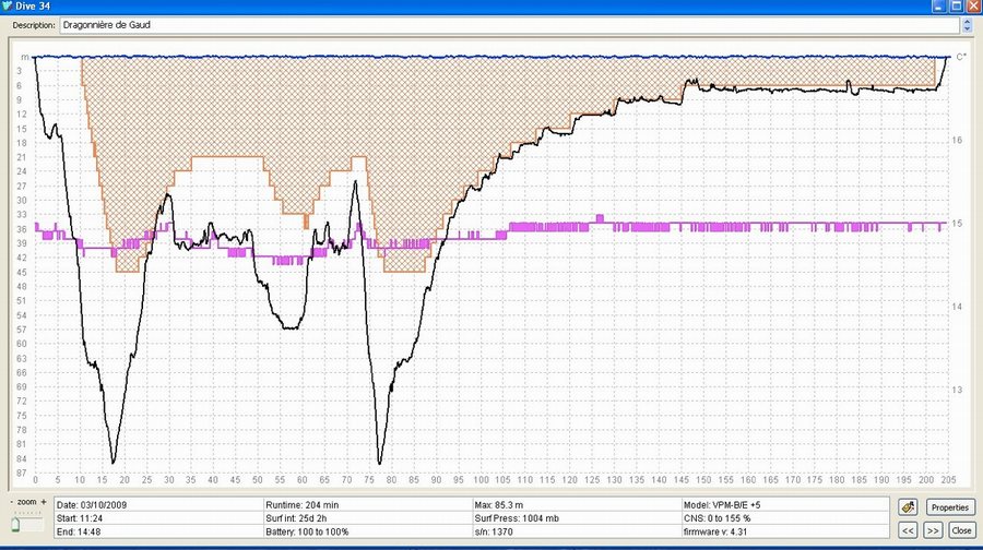 Matériel utilisé : recycleurs à circuit fermé : - « EDO 04 » à injection manuelle avec redondance en EDO semi-fermé ; Ligne de décompression de sécurité : O2: 2 x 7 L 200 b + 10L 200b 1 x 7L O2 200 b 1 x 20L 10/65 à 240b Progression au scooter Submerge UV 18, sur lesquels étaient montés le caisson vidéo + éclairage pour l'un et de l'éclairage + matériel re relevé topographique pour l'autre. Décompression calculée avec des ordinateurs multi-gaz à PPO2 constante embarqués fonctionnant sur l'algorithme VPM(1 par plongeur) + tables de secours calculées avec VPM. Vêtements étanches en néoprène 2mm pré-comprimé de marque SF Tech, modèle « Classic ». Durée des plongées : 3h35 (avec un ordinateur Liquidvision) et 4h05 (avec un VR3 en mode VPM).