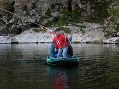 Décompression calculée avec des ordinateurs multi-gaz à PPO2 constante embarqués fonctionnant sur l'algorithme VPM(1 par plongeur) + tables de secours calculées avec VPM. Conditions : Température de l'eau : 15°C 4) we des 5 et 6 avril 2008 Le week-end dernier, nous avons poursuivi les investigations dans la Dragonnière de Gaud. Le niveau de l'Ardèche était très bas (en-dessous du 0 de la station de météo France à Vallon Pont d'Arc), ce qui facilite grandement le transport du matériel, chaque fois plus conséquent. Nous avons tiré une corde en travers de la rivière afin de constituer un guide, sur lequel se déhaler depuis la barque, et installé une échelle de spéléo pour monter le redan au-dessus du débarcadère en rive gauche. La visibilité était meilleure que lors de la dernière plongée (5 à 6m environ) Deux plongeurs en recycleur et au trimix ont poursuivi l'exploration de la cavité durant 260m. Le point terminal atteint se situe à 680m de l'entrée du siphon, à –37m. Un plongeur en tête équipait, le second suivait en filmant. Malheureusement, les conditions particulières dans la cavité (ampleur des galeries, obscurité des parois, visibilité médiocre) n'ont pas permis de réaliser des images valables. Arrêt sur durée d'immersion convenue. Récit succinct : « Tout le matériel avait été acheminé la veille jusqu'au siphon (scooter, recycleurs, bouteilles embarquées) et la ligne de décompression de sécurité était installée jusqu'à –60. Les gelées matinales tempérèrent sensiblement nos ardeurs, et c'est seulement à 10h20 que les deux plongeurs franchissent l'interface, sérieusement soutenus par toute l'équipe. Dès le départ, Eric fait des essais vidéo. Comme nous disposons de 20 minutes d'éclairage pour les prises de vues, il est convenu de ne pas insister si les images subaquatiques ne rendent pas. Afin d'économiser les batteries pour la galerie exondée si d'aventure nos émergions de l'autre côté du siphon. Un signe de dépit (c'est mal engagé pour la vidéo), combiné à un autre d'encouragement (à avancer) donne le départ. Le reéquipement du fil d'Ariane est bénéfique, et nous descendons « allégro », malgré nos scooters alourdis par le matériel vidéo. En 11 minutes, nous atteignons en le terminus de la partie topographiée (325m ;-83). Il est convenu que je poursuive la topographie, pendant qu'Eric tente à nouveau des prises de vue. Là, stupeur ! Je cherche mon compas (tout neuf car j'ai récemment perdu mon fidèle compas e relèvement dans une source pyrénéenne), accroché à un mousqueton sur la bretelle de droite, en vain. J'enrage, tant pour l'impossibilité de lever la topographie que pour le prix de l'instrument. J'en fait part à Eric par ardoise interposée. Tant pis, autant avancer, nous la ferons la prochaine fois. Le point bas (360m ;-89) est atteint en 15 minutes. L'ordinateur affiche 50 minutes de paliers. Nous amorçons la remontée en longeant d'abord un talus d'argile avant que le puits se verticalise, à partir de –75. La goulotte est striée de profondes cannelures verticales attestant d'un fonctionnement à l'air libre. Rapidement, nous retrouvons le dévidoir déposé à –54 (420m)lors de la dernière plongée. Nous entamons l'équipement de cette puissante verticale subaquatique (le puits « Messine…hein »), rythmée par les premiers paliers de décompression. Les points d'amarrage se font rare, il faut les guetter longtemps à l'avance. Les parois sont tapissées d'argile et de limons volatiles. Chaque pose d'amarrage génère un nuage d'eau trouble. Sous les surplombs, on remarque des espèces de formations limoneuses verticales, à l'allure d'algues souples, qui se délitent et s'effritent à la moindre turbulence. Nous remontons ainsi jusqu'à – 27, en vue du plafond. La suite n'est plus vers le haut, nous filons à l'horizontale en longeant une paroi verticale (rive gauche), sans vue sur le fond du puits. A 480m, le sol apparaît. C'est une vaste galerie de 5m de large pour 6 de haut, toujours tapissée d'argile (c'est une constante de la cavité). A 498m (-30), les parois se resserrent(4 x 4m), un chaos occupe le centre du conduit et deux options se présentent. Une galerie plus modeste, plus large que haute (4 x 2m) dans le prolongement (210°), ou une lucarne (3 x 3m) en hauteur en rive gauche. Le temps de raccorder un nouveau dévidoir, Eric s'assure que les deux itinéraires se rejoignent illico. Nous optons pour le bas, le plus large, qui nous ramène rapidement à –40, avec un point bas ponctuel à –42. Des Isopodes particuliers : le Spheromides Raimondi, occupent également cette partie de la cavité (la galerie « bienvenue chez les cht'…ouilles »). Nous en avons observé partout dans le siphon. La galerie se restreint ponctuellement à –42, à la faveur d'une échancrure verticale, puis reprend de confortables dimensions (de 4 à 6m de large pour 4 à 3m de haut). Vers 560m, on passe un thermocline dont nous n'avons pu évaluer l'amplitude, faute de demeurer suffisamment longtemps sur site. Il y a certainement une arrivée d'eau dans ce secteur, plus claire qui plus est. Un joli redan vertical ramène à –35, avant de plonger à –38. Nous stoppons une heure après le départ, arrivés au terme du second dévidoir, à 680m de l'entrée(-37). Nous venons d'explorer 260m de galeries noyées globalement orientées sud-ouest. Pris dans un nuage d'eau trouble (particules soulevées lors de la réalisation de l'amarrage terminal), nous rebroussons la palme la main sur le fil, l'autre tractant le propulseur, devenu inutilisable dans ces conditions. Pour peu de temps heureusement, mais pareille mésaventure se produira à nouveau au point pas de –42, dans lequel les eaux chargées (lors de notre passage à l'aller) semblent s'être concentrées. Il ne doit pas y avoir beaucoup de courant dans la cavité, ces temps-ci. Les ordinateurs annoncent alors 7