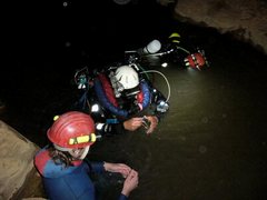 Progression au scooter Submerge UV 18, sur lesquels étaient montés le caisson vidéo + éclairage pour l'un et de l'éclairage pour l'autre. Décompression calculée avec des ordinateurs multi-gaz à PPO2 constante embarqués fonctionnant sur l'algorithme VPM(1 par plongeur) + tables de secours calculées avec VPM. Vêtements étanches en néoprène 2mm et 4mm pré-comprimé. Plongées de 240 et 271 minutes. Conditions : Température de l'eau : 15°C Camp 2-4/10/2009 Ce premier we d'octobre a été mis à profit pour poursuivre l'étude et l'exploration de la Dragonnière de Gaud (commune de Labastide de Virac), dans les somptueuses Gorges de l'Ardèche. L'étiage exceptionnel a réduit la rivière à un « pissadou de chagrin », ce qui facilite les traversées et un petit peu le portage. Le vendredi après-midi, nous nous retrouvons à 14 heures à la barrière de la piste, avec Judicael, Mehdi et Emerick. Après avoir déchargé les véhicules, nous embrayons illico sur l'équipement des passages à sécuriser, notamment Judicaël (franchissement de la rivière, redan extérieur, ressaut + vire dans la caverne) et le portage de tout le matériel. Eric et Arthur arrivent pour le goûter, et à 18 heures, Emerick et Mehdi s'immergent pour installer les bouteilles de décompression de sécurité à –6, -18 et –30. En soirée, Jean-Pierre et Catherine nous rejoignent. La nuit est sublime, lune presque pleine, éclairages rasants sur les hautes falaises, pas un nuage, concert de craquements de bois défoncés par les hordes de sangliers coutumières des lieux. Nous avons convenu d'un premier rendez-vous de contact 3h30 après le départ, puis un autre chaque 30 minute ensuite. Le profil ascendant nous laisse espérer une poursuite de la remontée, et pourquoi pas, un franchissement… L'espoir, les fantasmes, le disputent aux hypothèses plus raisonnées. Nous nous immergeons à 11 heures. Eric a monté son caisson vidéo + éclairages sur le scooter. La veille, j'ai procédé à divers test afin de m'assurer que le scooter ne perturbe pas le compas de relèvement. En effet, il faut le tenir éloigné de 40cm au moins pour éviter les perturbations magnétiques. Nous évoluons dans l'eau troublée jusqu'à la limite des plongées précédentes. Passé le rétrécissement de –65, l'horizon se révèle. La visibilité est exceptionnelle pour la cavité, que nous avions jusqu'alors parcourue dans un brouillard. Avec 8m environ, l'intégralité de la section est visible. Nous nous autorisons quelques distances, ponctuelles, avec le fil d'Ariane afin d'optimiser les trajectoires au scooter et limiter la turbidité près du fil, lors du retour. Et aussi parce que c'est fichtrement bon ces « rides » hypogées. Au terminus topo (325m;-82), j'attaque le relevé. Le carnet, fixé ouvert sur le corps du scooter, libère une main tout en offrant un support bienvenu. Le compas, solidarisé du poignet par une dragonne, ne risque plus de jouer les filles de l'air. Nous atteignons le point bas (-87) 18 minutes après le départ. Allumage des feux, et amorce de la remontée, dans une jolie galerie d'abord, puis une impressionnante fracture verticale, haute de 67m. Eric filme, les visées topographiques alternent avec les premiers paliers de décompression. Je dépose une bouteille de 20l en sécurité, pour un éventuel passage retour de la galerie profonde en circuit ouvert. Nous regardons de plus près le talus afin de réduire la profondeur du point haut, en tête du puits. Rien à faire, il faut passer à 30m, une sorte de col ponctuel. Cela fait 30 minutes que nous avons quitté la surface. Nous poursuivons de la sorte notre tandem vidéo-topographique, dans la sinuosité modérée du conduit. Si la visibilité s'est considérablement améliorée depuis les explorations précédentes, le conduit est tout autant intégralement tapissé d'argile. Les quelques bulles expirées décrochent des rideaux d'argile, qu'une palme effleure une paroi, qu'une visée impose un appui au sol, l'eau s'opacifie immanquablement. La prise de relevé est un tantinet acrobatique, j'essaie de limiter au maximum les contacts avec les parois. Mais la majorité des amarrages sont au sol, à défaut d'autres possibilités de fixation. A 560m du départ de la partie noyée, nous retrouvons le thermocline observé la fois précédente. L'eau plus fraîche surmonte celle, plus chaude (15°C) du siphon. Lors de l'exploration précédente, alors que l'eau du siphon était moins claire, la couche supérieure était plus limpide. Aujourd'hui, c'est le contraire. La tranche d'eau superficielle est sale, grise. Elle s'étale sur une trentaine de mètres, puis disparaît. Eric passe devant, comme convenu, pour prendre quelques images des relevés topos, faire quelques prises de vues avec un sujet en progression frontale. Nous ne sommes plus très loin du précédent terminus, matérialisé par le dévidoir abandonné la fois précédente, dans un nuage de touille. J'avance au scooter en finalisant une prise de cap, un tantinet ébloui par les phares d'Eric qui s'est décalé en rive gauche. Ce faisant, l'argile flue vers le sol, masquant la partie inférieure de la galerie. Je cherche des yeux le fil d'Ariane, en quête de la prochaine station topographique, sans arriver à le localiser. Surtout pas dans la purée qui recouvre à présent le sol. Alors que j'envisage de dépasser le nuage, j'entends les invectives orales d'Eric qui m'indique, force gestes à l'appui, que le dévidoir laissé en avril 2008 est là, au milieu des volutes opaques. En effet, j'aperçois, l'espace d'un instant, la gaine orangée de la poignée. Piquant illico sur ce bobineau, qui symbolise le point ultime de la précédente exploration, je l'attrape à tâtons. Nous avions convenu de dérouler les quinze mètres encore disponibles, afin de garantir la continuité du métrage du fil. Manque de chance, l'année en immersion a définitivement bloqué l