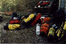 | Matériel utilisé : 2 bi-bouteilles de 9L gonflés à l’air, 1 bi-bouteille de 12L et 1 bi-bouteille de 18L (air) ; 4 relais Nitrox 50%(2x10 L, 1x 9L et 1x12 L) + 1 bouteille de 5L d’oxygène médical (pour le cas ou !). |