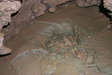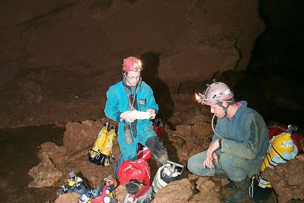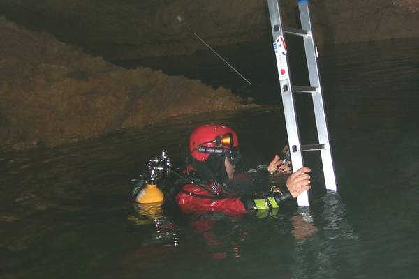Quelques contorsions seront à consentir pour chausser les palmes dans le bassin où nous n'avons pas pied. Nous nous succédons sur une arête ténue constituant l'unique point d'appui avant de cabucer dans le S.5 (130m;-13). Les deux points hauts sur d'imposantes dunes d'argile et de sable agrémentent la progression, puis après une brutale remontée, c'est enfin l'émersion.