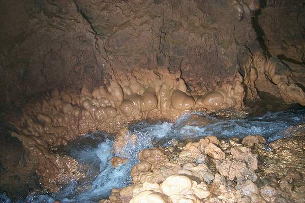 | J'assure mon sherpa préféré d'un "cinquième appui" en exerçant une poussée sur la partie la plus charnue de sa personne. Là aussi, "l'entraînement" collectif de jeudi a rôdé la manoeuvre et il ne proteste même plus de ce soutien peu commun... Après une dernière désescalade argileuse, équipée en corde pour la circonstance, nous retrouvons la rivière qui coule, enchanteresse, en une succession de cascatelles et de magnifiques biefs vert céladon. Les voûtes échappent à la vue, quelques vingt mètres plus haut. Nous nous accordons quelques minutes de contemplation béate, fascinés par la puissance et l'ampleur du lieu. |