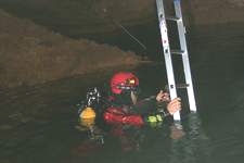 Mais les copains avaient répondu présent, matériellement et physiquement, avivant l'ardeur et la motivation. Et aujourd'hui, gràce à eux, nous étions là en partance pour le S.6. Dans le S.4 (82m;-20), j'apprécie les dimensions plus humaines du conduit qui se dévoile par moment dans le faisceau des phares. Le contraste avec la salle aquatique de sortie n'en est que plus saisissant, et après le prolongement de la séquence palmage, le retour à la station verticale s'impose. |