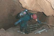 -39, au terme d'un vaste puits le conduit devient plus vaste. En longeant la rive droite durant 65m, on dépasse soudain une lèvre de puits pour buter sur un miroir de faille, à -46. Pas de doute, la suite est en profondeur indiquée par l'ancien fil retrouvé qui plonge à la verticale. -50, le plafond disparaît du champ de vision.