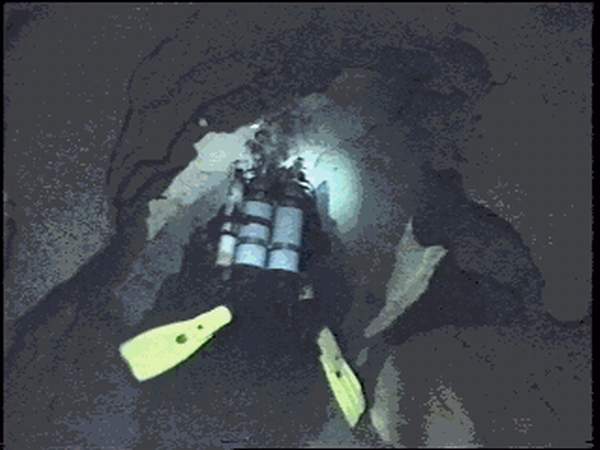 Puis c’est au tour de David Bianzani de continuer, et au bout d’une heure il m’annonce à la radio que le passage est assez grand pour pouvoir faire passer un plongeur. Dans la foulée, je m’équipe d’un bi 9 litres et me jette à l’eau. Une fois au fond, je passe mes pieds puis mon corps par l’ouverture et à l’aide de ma pelle US, fais descendre les cailloux dans la galerie, en les disposant sur le côté, pendant que David continue le pompage. Une fois l’ouverture assez grande, je ne retiens plus mon excitation, et je pars dans la galerie. Une très grande joie m’envahit de pourvoir palmer dans un lieu qui n’a plus vu de plongeur depuis 17 ans. Le fil est toujours en place, la roche est plutôt sombre et un dépôt de poussière se soulève à mon passage. Je fais 60m dans une galerie de 1.50m par 2m, et je m’arrête par -18m sur un puits vertical, devant la crépine d’aspiration qui aspire l’eau et la rejette au-dessus, sur le côté gauche de la vasque. Je fais très vite demi-tour et je remonte à la surface pour annoncer la bonne nouvelle aux copains. Nous passerons l’après-midi à stabiliser la trémie, sur le dessus. Maintenant un plongeur en gros scaphandre peu passer sans difficulté par l’étroiture.