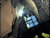 | En bout, un nouveau puits m’amènera à -120m. Je ne trouve rien pour amarrer mon fil, alors je sors le plomb, récupéré plus haut, de ma poche et j’accroche mon fil. Une fois attaché, je fais demi-tour sur moi-même et regarde la galerie profonde que Joseph Schneider, mon prédécesseur, avait décrite. La profondeur ne correspond pas tout à fait, il me manque 5m sur mon profondimètre, mais il n’y a aucun doute, c’est bien elle. Nos efforts commencent à être récompensés. Mais une mauvaise disposition de mon équipement, me font renoncer à poursuivre plus loin, et, par prudence, je préfère remonter, malgré une importante réserve de gaz restant sur mon dorsal. |