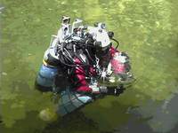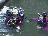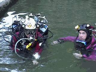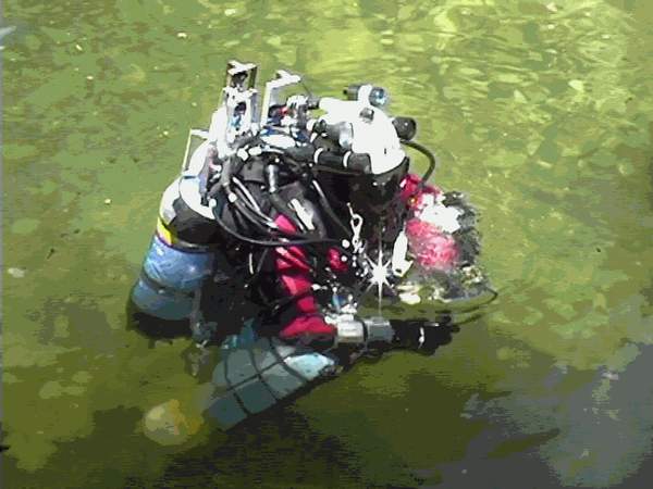 Il est 13 heures, et après une bonne salade de pâtes, je commence à m’équiper. Je m’habille en premier de mes sous vêtements en laine, et par cette belle journée très ensoleillée de juin, une fois dans mon étanche, je transpire à grosses gouttes. Je me dépêche de sauter à l’eau pour me rafraîchir un peu. J’ai disposé mon scaphandre composé d’un tri 20, sur le bord de la vasque, à l’ombre, et aidé par mes assistants, Jean Marc Belin, François Beluche, Laurent et Stéph, je m’équipe consciencieusement. J’ai décidé ce faire cette plongée en comité restreint, et il est plus facile, pour moi, de se concentrer dans ces conditions, par rapport à la dernière fois.