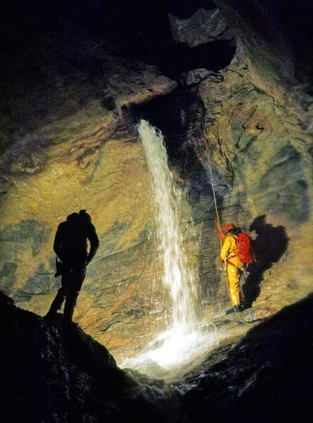 La Galerie du Chaos franchie, il faut alors progresser dans un canyon où l'eau stagnante contraint à de fréquentes immersions. A 5250m de l'entrée, on atteint enfin le terminus du S.C. Lyon, constituépar une cascade de 5 m qui en période d'eau moyenne oblige l'explorateurà une douche forcée. L'obstacle franchi, il faut escalader encore quelques courtes cascades et traverser des bassins parfois profonds qui jalonnent sur près de 600m le fond du méandre dont les dimensions restent invariables (2m de large et près de 20m de haut). Par endroit, quelques coulées stalagmitiques inopportunes viennent obstruer la galerie sur plusieurs mètres, contraignant l'explorateur à des escalades rendues acrobatiques par le port de la combinaison en néoprène. La plus importante, la Bareusai, ne mesure pas moins de 8 m et nécessite un minimum d'équipement.