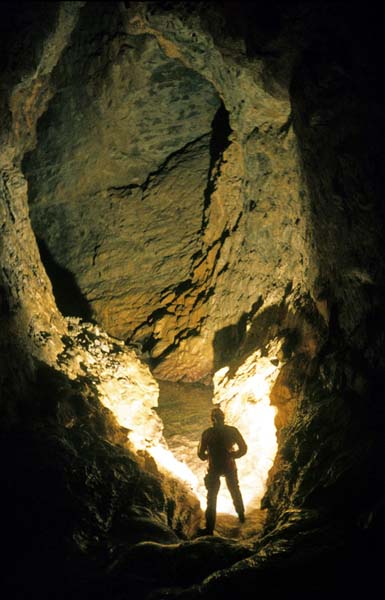 Au-delà du S2, la voûte se relève, et le plongeur prend pied dans une salle encombrée d'éboulis qu'il faut contour-ner en s'insinuant entre les blocs. Des départs en plafond ont été entrevus, confirmant l'existence de galeries supé-rieures. Plus loin, le conduit reprend son profil de canyon régulier, offrant au visiteur un décor parmi les plus esthéti-ques de la cavité. A environ 400 m du S2. une cascade surplombante de 5 m vient interrompre la progression. A l'aide de quelques spits, l'obstacle est franchi. Une autre cascade lui fait suite, puis nous retrouvons la galerie qui remonte tou-jours de façon régulière. A 700m du S2. celle-ci débouche au pied d'un vaste éboulis qui conduit à la Galerie du Chaos. Le silence, l'absence d'eau, l'élévation des voûtes (20 x 20m), incite tout naturellement le visiteur au repos, et c'est ici que les différentes équipes installèrent leur bivouac.