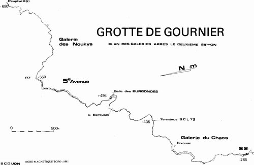 28, 29 et 30 mai 1981 : plongée S.C. Dijon. Le bivouac est installé dans la Salle du Chaos (500 m avant le terminus du S.C. Dijon), à 4750m de l'entrée. Une pointe unique de 10h conduit les 3 plongeurs au fond de la 5° Avenue, à + 560m (Spelunca 1981 N°4), après avoir parcouru 2200m de galeries nou-velles (Topo).