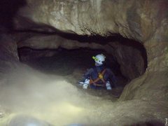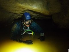 Le rendez-vous avait été fixé à 10h00 à Pont en Royans, mais voilà nous débutons avec une demi-heure de retard Gaby a eu un problème d’oreiller ou traversin je ne me souviens plus de son histoire matinale. La neige est là pour agrémenter notre portage, les conditions sont idéales le talweg n’est pas trop glissant pour accéder à la grotte.Nous prenons de l’avance avec Dirk pour planter deux spits en haut du ressaut de 4 mètres qui mène au réseau. En moins d’une demi-heure les spits sont plantés, la corde posée et les charges sont en haut du ressaut dans une petite salle.La cavité est très sympathique les dimensions sont de deux par trois, la galerie diminue après un passage ascendant, de petites vasques d’eau ponctuent le parcours. Gaby est arrivé entre temps nous l’aidons à monter ces charges de plongées, et comme je l’avait annoncé, on topographie à l’aller histoire de ne pas remettre à demain ce que l’on peut faire le jour même… D’après mes infos, je savais que le Siphon 1 était court, pas large et ni très clair. Je décide d’envoyer Gaby en éclaireur comme ça, il allait profiter de la visibilité le chanceux…il fera un aller retour histoire de nous en faire un compte rendu complet. Après immersion il nous annonce que le siphon est peu profond 2 m, très court 10 m, mais il comporte une étroiture. Rien de bien alarmant, on a prévu la config à l’anglaise (bouteilles sur les cotés). La plongée ce passe sans encombres. Le réseau derrière est très boueux les dimensions sont de 1.5 m par 2 m . Quelques départs à droite et à gauche méritent une inspection plus attentive, nous nous contentons du réseau principal. Sur le parcours, une vasque d’eau attire notre attention, à une cinquantaine de mètre du S1. Nous y mettrons les palmes tout à l’heure. Un joli puits de deux mètre agrémente le parcours qui conduit au S2. Par contre toujours autant de boue, bonjour l’état du matos ! Après environ cent cinquante mètres, nous voici devant le S2. Surprise, pas de fil. Peut être que le niveau d’eau est monté ? Comme le S1, il donne l’impression d’être limpide, mais bon, la photo du départ en témoigne : il se trouble en quelques secondes, je ne m’engage pas trop dans la vasque pendant le temps qui m’est imparti pour ma préparation, histoire de garder de la visibilité. En cinq minutes je suis prêt mes camarades ont amarré le fil. Je teste les détendeurs, et me voilà parti. Je distingue devant moi après le nuage de touille, la suite de la galerie qui plonge à un mètre de profondeur, puis qui remonte. Je vois le fil jaune fluo du dernier explorateur (Dominique Belle) amarré à un becquet rocheux, mon intuition était la bonne, le niveau d’eau est monté. Je fixe de nouveau mon dévidoir, et je poursuit mon exploration après trente mètre de fil tiré et le passage de deux nouvelles étroitures, je scrute le sol qui est jonché de petits blocs j’insiste sur le plafond : rien, lisse (pas de trémie ouf…). Au retour Gaby mis les palmes et un bloc dans la vasque vue auparavant. Malheureusement, celle-ci de donna rien, elle part en diaclase inclinée puis débouche trois mètres plus loin sur une galerie latérale qui conduit dans le réseau en direction de la sortie. Je vais questionner Robert –Jean et Dominique Belle qui en connaissent bien plus sur cette cavité. La suite bien sur dans le prochain épisode. Pour info la cavité n’est pas très grande avant le S 1 mais mérite un coup d’œil il y a une petite colonie de Chauve souris j’en ait compté quatre à ne pas déranger bien sur. David Bianzani