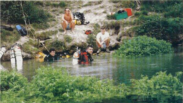Depuis 1995, une intense activité anime, chaque été, le paisible village de Ruelle-sur-Touvre (Charente). Plus précisément dans le parc qui abrite les célèbres sources de la Touvre, zone hydrokarstique complexe qui donne naissance à trois fontaines. Le Dormant semble rapidement colmaté au fond d'une vaste vasque. Du Bouillant, tout proche, en revanche, jaillit un puissant courant accentué par l'étroitesse de la zone d'entrée. Cette source, explorée dans sa zone profonde à -80 mètres par Ph. Lance, -133 mètres par Cyril et à -148 mètres en 1990 par Olivier Isler, se présente comme un long couloir très pentu terminé par une modeste galerie horizontale. Enfin, à une centaine de mètres à vol d'oiseau, on trouve la fontaine de Lussac, un peu à part, elle-même assez complexe, bien qu'en relation évidente avec le Bouillant. |