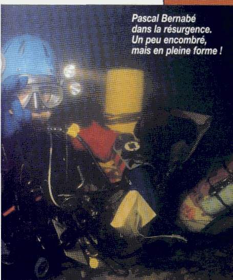 à -75 mètres. Là, trois possibilités : un puits direct exploré à -82 mètres par C. Touloumdjian, puis -86 par H. Foucard et enfin -90 mètres par Ludovic Giordano en 1995. À cet endroit, la suite est impénétrable. On peut aussi faire quelques mètres à -76 mètres. À droite s'ouvre alors un grand entonnoir. Suit un puits donnant à -115 mètres sur une galerie, vaste et encore mal définie, elle-même assez complexe, où un courant violent nous fait penser qu'il s'agit là de l'actif. Il semble préférable d'éviter l'aval aspirant qui part sur -120 mètres... Claude Touloumdjian a exploré en 1986 un puits donnant sur une petite galerie horizontale à -125 mètres, mais l'absence de courant lui a suggéré que l'actif n'était pas là. En 1990, il est revenu et après quelques dizaines de mètres à -115, a trouvé la suite dans un nouveau puits à -120 mètres. Encore en 1986, Hubert Foucard, après un parcours à -75 mètres, a découvert un au-tre puits à quel-ques dizaines de mètres des précé-dents, qu'il a exploré jusqu'à -125 mètres. Un système compliqué, donc difficile à comprendre, et dont l'exploration n'est facilitée ni par la profondeur, ni par la visibilité, généralement mauvaise. |