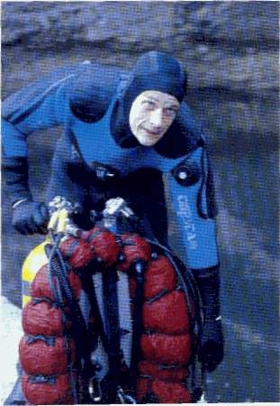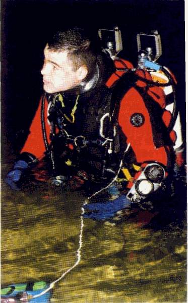 | Six bouteilles de 20 litres, une de 3 litres d'argon pour insuffler le vêtement, les Wings, le casque avec 3 lampes et un phare MLS, 3 profondimètres, une montre, un dévidoir garni de de fil d'Ariane, une boussole, un ciseau, un sécateur, un plomb largable, des élas-tiques de chambre à air, deux jeux de tables, une gueuse, des plombs de chevilles, un masque de secours, sans compter les multiples épaisseurs de fourrure polaire, ne rendent pas l'individu très aquatique ! c'est donc un piètre spectacle de mise à l'eau que j'offre aux promeneurs du parc de la Touvre ! Je m'enfonce dans le canyon jusqu'à -12 mètres et dois tirer sur la corde pour franchir le rétrécissement de l'entrée. La visibilité n'est pas très bonne, les fortes pluies ayant probablement remué le tapis d'argile posé sur le fond de la galerie. A -21 mètres, derniers réglages de configuration, mise à zéro du chrono, changement de gaz et c'est parti pour une longue descente entrecoupée de replats. |