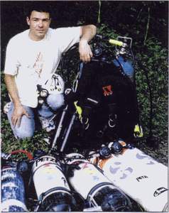 Je progresse lentement, peniblement, dans l'obscurite de la caverne noyée. Une heure à palmer avec trop de bouteilles, contre un courant trop fort, dans un siphon en crue. Au moins cette crue a l'avantage de reléguer le seuil rocheux a escalader entre le siphon 1 et le siphon 2 au rang des mauvais souvenirs. L'eau passe a présent au dessus... Alors que la semaine derniere, lors des plongées de portage, it fallait encore patauger dans la boue apres les 110 mètres du siphon 1, puis se hisser laborieusement au-dessus de ce maudit seuil, avec les lourdes bouteilles de decompression, ou encore, les 60 kilos du scaphandre dorsal, en nage dans les combinaisons étanches, le souffle coupé par l'effort et l'excès de C02! Mais la belle vasque du siphon 2 en vaut bien la peine. C'est la clé de ]a poursuite de l'exploration de cette magnifique rivière souterraine. Une invitation bleu vert a la première. -68 mètres, la fin du fil d'Ariane, mon terminus de 1996 est là. Devant l'inconnu.