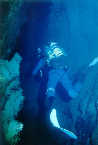 A 20 H, équipés, nous replongeons le S2, à - 40 nous retrouvons le relais que nous emportons, et c'est avec cinq bouteilles que nous rentrons. La traversée du laminoir à - 68 se passe bien, la narcose anesthésie le corps, et supprime toutes souffrances, notre cerveau suralimenté en 02 nous donne un contrôle étonnant.A cette profondeur et avec nos charges,dans un passage étroit où nous nous accrochons aux rognons de chailles nous sommes bien. Je suis Didier qui me donne l'échelle exacte du lieu . Je prends plaisir à le regarder évoluer dans les miroirs du plafond, qui ne sont autres que les autres que les bulles d'air piégées dans les surcreusements de la voûte A - 38 nous échangeons 1 x 12L et repassons le puits - 63, et regagnons le relais .