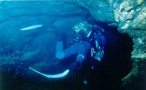 Nous inhalons 15' d'oxygène médical chacun, permettant une meilleure désaturation d'azote Nous faisons quelques photos, et nous nous alimentons de produits très énergétiques sélectionnés et fabriqués par VITAGERMINE SPORT. Deux heures plus tard, nous décidons de la suite des opérations : Didier, le plus en forme , sera l'explorateur du S3. Je l'aide à s'équiper ; il endosse son tri bouteilles et se met à l'eau. J'attache le fil d'ariane et fais quelques photos de ce moment privilégié . Didier part au centre du puits large de 7m de diamètre et se laisse couler. A -11, il cherche un passage entre les gros blocs qui masquent la galerie qui fait suite ; trouvant une issue, il s'y engage et découvre sa galerie. Celle-ci s'en fonce progressivement jusqu'à -24, et remonte à nouveau. Arrivé à la base d'un grand puits, Didier remonte espérant retrouver la galerie sèche. A - 6, il est abusé par une nappe d'eau douce piégée, qui lui donne l'impression de voir la surface de l'eau. Sur le haut du puits, la galerie redescend à nouveau. Didier reprend la progression. A -11, frappé par une migraine soudaine, Didier décide de s'arrêter . I1 coupe son fil d'Ariane , et l'attache au rocher. Distance franchie : 200 m L'orientation générale du siphon est sud-ouest et plus l'on progresse et plus celui- ci devient boueux.