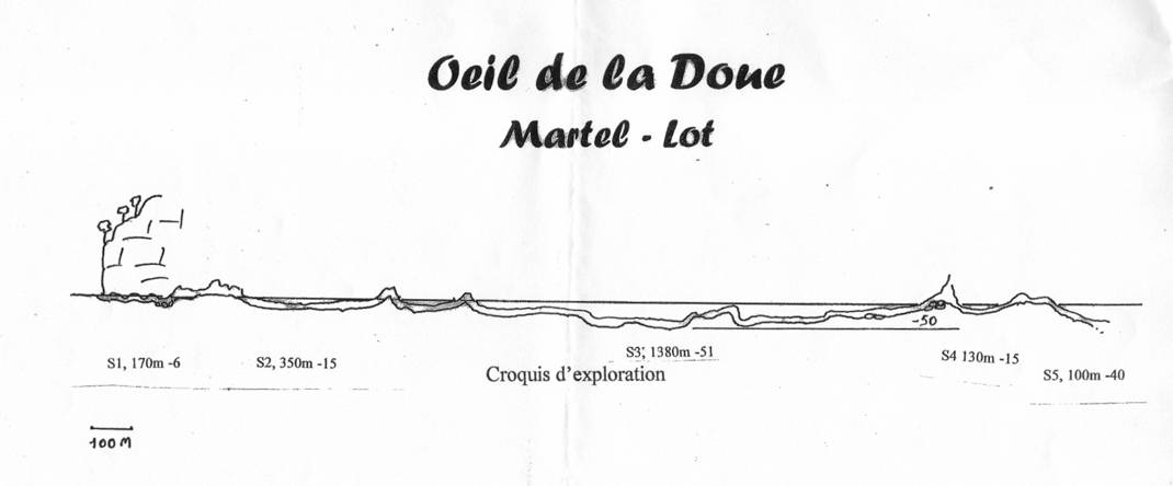 Le premier siphon est plongé en 1976 par PEJOUT et VERLHAC. Plus tard Claude TOULOUMJIAN sort le S2 et poursuit l'exploration dans le S3 et s'arrête à 700 mètres. Frédéric BERNARD, en 1993, le rallonge jusqu'à 1295 mètres et y découvre le shunt. Puis Patrick JOLIVET y rajoute quelques mètres et moi dans la foulée, je m'arrête sur palier après y avoir déroulé 40 mètres. En 1998, accompagné de Marc DOUCHET, je sors le S3 : 1380 mètres -50, et y découvre 70 mètres de galerie. Nous plongeons le S4 sur 80 mètres arrêt à -17 mètres. L'Oeil de la Doux est une très belle résurgence, son débit peut-être considérable mais dans les périodes sèches, la rivière ne coule plus par son ouverture au pied de la falaise. Parfois même le S1 se passe à pied sec jusqu'au S2. Le S1 (170 m-6), est suivi d'une belle galerie en canyon où coule la rivière. Après le S2 (350 m, -15) nous enchaînons le S3 (1380 m point bas -52). Il débouche sur une galerie de 70 mètres de long «galerie FRED ». Puis le S4 plongée sur 70 mètres arrêt -17 azimut 30°. SEMAINE DU 10 AU 19 AVRIL 1999. Comme d'habitude le groupe à rendez-vous «chez GABY » à Magès à quelques kilomètres de Rocamadour. Cette année, quatre débutants se sont greffés à l'expédition, en suite logique de nos stages. L'Oeil est un réseau parfaitement adapté à leur première exploration post siphon. Comme en 1998, le niveau de l'eau est très haut ce qui rend les portages plus faciles. Mais bien sur, la pluie accompagne nos portages extérieurs, heureusement elle n'aura pratiquement aucune conséquence sur la turbidité du réseau. PREMIER JOUR (mise en condition) La sortie du S1 est toujours délicate surtout pour les scooters, nous avons décidé d'installer un câble au début du canyon, il permettra de les passer en tyrolienne pour éviter les chocs. Tous les relais sont portés devant le S2, pour permettre un premier voyage à 700 mètres dans le S3. Bernard GAUCHE est venu nous prêter main forte, malheureusement il ne reste qu'un jour. DEUXIEME JOUR. Marc Renaud, Jean Christophe, Michel et Kiki partirons les premiers pour étaler le reste des blocs. Avec Marc Douchet, nous attendons leur retour devant le S2 assis sur la dune. A leur arrivée, nous partons en chevauchant nos montures, au bout d'environ 150 mètres j'ai une sensation bizarre : le scooter s'en va sans moi, je comprends immédiatement : Je viens de casser ma «barre à cul ». Tandis que je bricole un système pour pouvoir rentrer, j'entends Marc qui continue. Il effectuera son portage et à sa sortie après une petite discussion, un arrangement est conclu. Le jour de la pointe nous récupérerons une bouteille chacun au passage et HOP ! C'est réglé, une journée de gagnée. TROIXIEME JOUR (promenade) C'est la détente quelques-uns uns iront plonger avec les débutants à «fond DELTRUF » et pour d'autres un petit retour à l'OEIL est nécessaire pour peaufiner le tout, la bonne humeur est là, nous sommes à la limite de ne pas vouloir sortir du trou car dehors le froid et la pluie nous attendent. Le plus heureux d'entre nous s'est Olivier GASPE car pour lui c'est un retour aux sources. QUATRIEME JOUR (la pointe) Nous sommes accompagnés de Kiki et de Michel, ils sont venus pour nous bichonner, le départ est un peu retardé par un détendeur capricieux. Mais ça y est ! Nous nous attendons à chaque passage de relais et quand le ronronnement du deuxième scooter ne se fait plus entendre le premier attend l'autre. Après quelques longues minutes nous arrivons à la sortie du S3 dans la zone des paliers. Le froid est avec nous, tous les deux nous avons les mêmes pensées : ou est notre petit poisson fétiche qui avait accompagné pendant nos paliers de l'année précédente, il n'est pas au rendez vous. Avec quelques signes j'explique à Marc qu'il doit être énorme maintenant alors attention ! Je sors le premier il est 12 h 50 je me dépouille de mon gros bi devant le S4 et maintenant il nous reste plus qu'à attendre quelques heures interminables. Première chose pour passer le temps manger, se désaltérer et préparer les hamacs que nous avons laissés auparavant. Entre lecture et compétition de GAME.BOY malgré les «branlées » que Marc m'inflige (il doit s'entraîner régulièrement ). Il est maintenant 18h00 c'est l'heure de se remettre à l'eau pour continuer le S4, l'arrivée au terminus se fait sans encombre malgré un détendeur qui avale des cailloux dans le début du passage bas. Le dévidoir tourne, je scrute l'horizon et je regarde mon profondimètre le siphon remonte régulièrement, ça y est je viens de le sortir 60 mètres de déroulé ce qui nous donne au total, 130 mètres -17 dans le S4. Marc arrive à ma rencontre après avoir attaché le fil sur tout le parcourt. Nous sommes maintenant dans une galerie exondée toujours en forme de canyon que nous parcourons harnachés de nos bi 20 litres. Au bout de 100 mètres le départ du S5 est devant nous, Le siphon est de dimension honorable, dès le départ il descend sur une pente de sable, il mesure environ 4 mètres de large sur 2 de hauteur, il suit la direction générale du réseau, mais descend toujours. Je dois m'arrêter dans la zone des 30 mètres, le profil ne me permet pas de continuer trop profond je n'ai pas prévu de décompression fiable. A - 30 mètres la pente est toujours aussi régulière, je glisse à -38 mètres ou un petit trou dans la roche me permet d'accrocher mon fil et d'arrêter ma progression. Un petit coup d'oeil sur mon compas, 340° et cela descend encore. Je rejoins Marc qui attache avec minutie le fil et tout en remontant, nos regards se croisent, il va falloir prévoir pour la prochaine pointe, une autre méthode pour continuer l'exploration du réseau. Au retour au campement, il faut encore attendre avant de rentrer au bercail, déssaturation oblige. J'en profite pour prendre le maximum de notes et je retourne dans mon lit douil